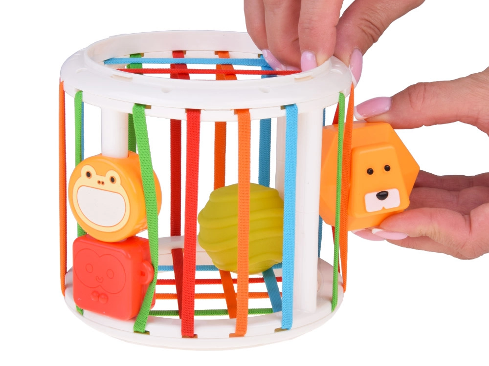 Il sorter è composto da fasce elastiche colorate che consentono di inserire ed estrarre i pezzi con facilità, sviluppando naturalmente la presa, la forza e la precisione delle dita. Non manca un piccolo specchio di sicurezza per esplorare il proprio riflesso e un set di 7 elementi multicolori da inserire. Il tutto stimola udito, vista e tatto, favorendo concentrazione e scoperta autonoma.