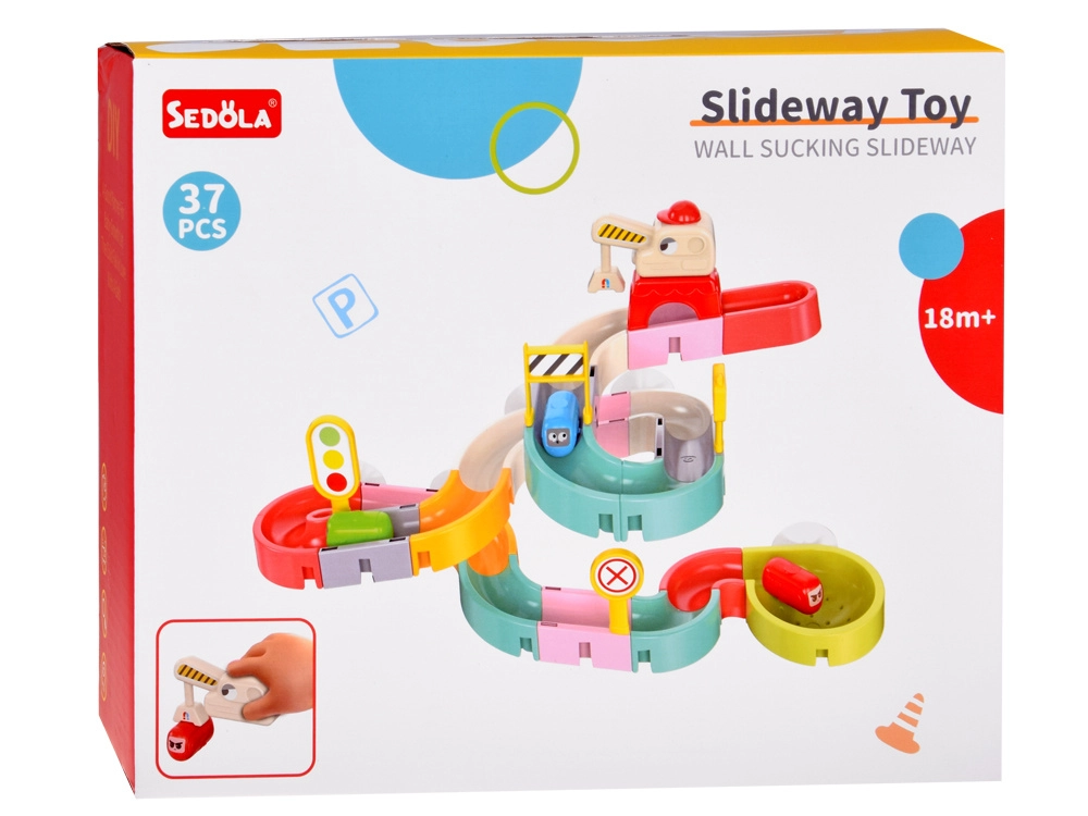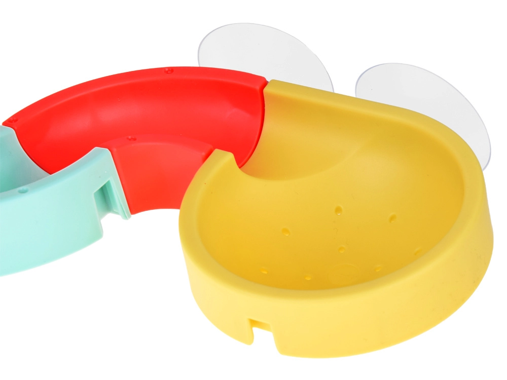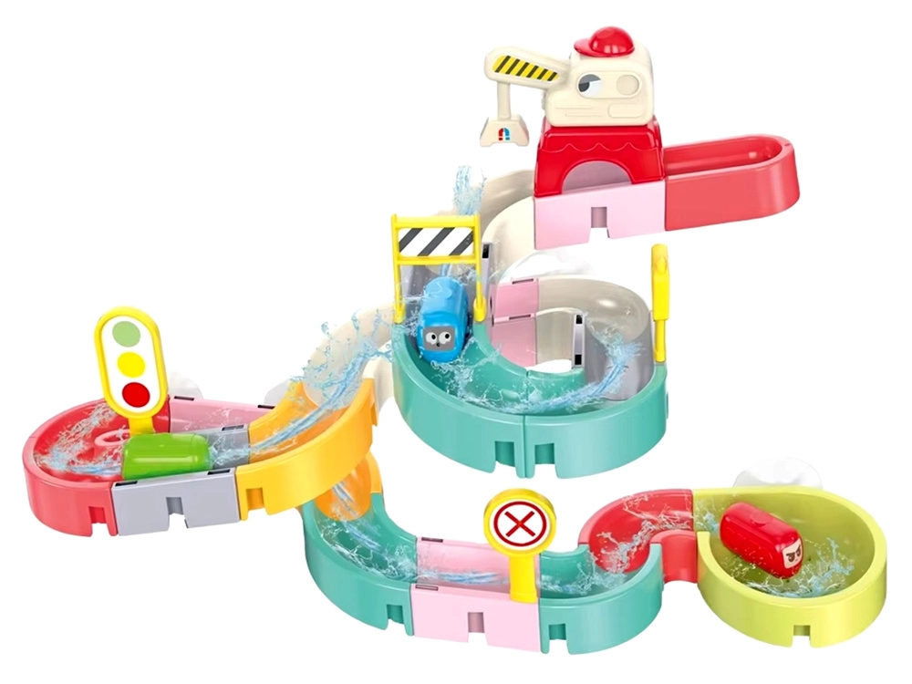 Questo set creativo per il bagno attira i bambini con pezzi colorati, tema stradale ed effetti d’acqua. Con 37 componenti si montano canali sinuosi e scivoli su cui le macchinine a capsula galleggiano e rotolano con l’aiuto dell’acqua. Le ventose in silicone fissano gli elementi saldamente su superfici lisce e il terminale con colino crea una divertente mini doccia.