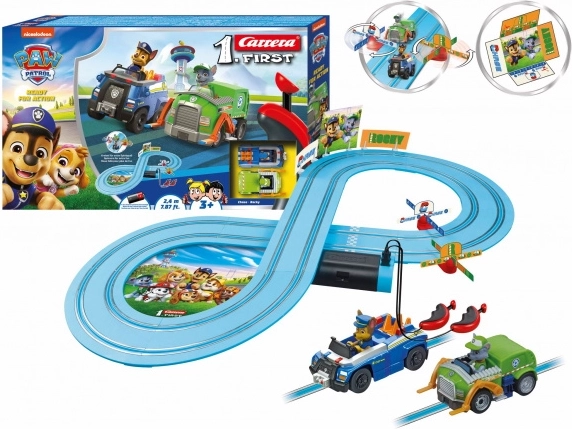 La divertente pista CARRERA FIRST con il tema PAW Patrol offre ai bambini dai 3 anni le prime esperienze di gara. Inclusi le auto di Chase e Rocky, comandi semplici, eliche rotanti per maggiore emozione e una pista lunga 2,4 m. L’alimentazione a batterie permette un uso ovunque e il montaggio facile con sistema a clip farà felici i genitori.