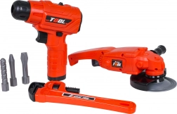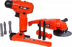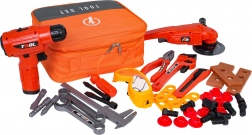 - borsa, trapano/avvitatore a batteria, smerigliatrice angolare, calibro a corsoio, chiave regolabile, chiave a forchetta e a bussola piana, pinze, coltello, cacciavite con portainserti e bit, occhiali protettivi, 7× elemento da avvitare, 10× dado, 10× vite