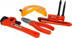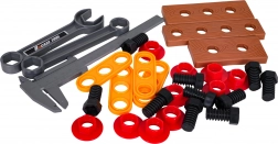 Chiavi, pinze, coltello, cacciavite con inserti, smerigliatrice angolare, calibro a corsoio, occhiali protettivi, viti, dadi e pezzi di collegamento sviluppano la motricità fine.