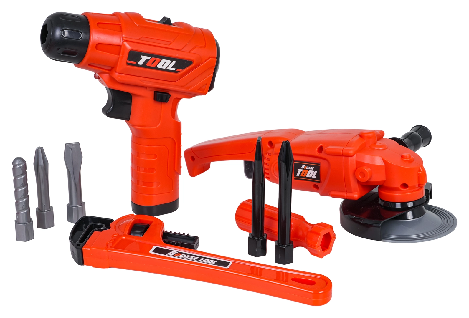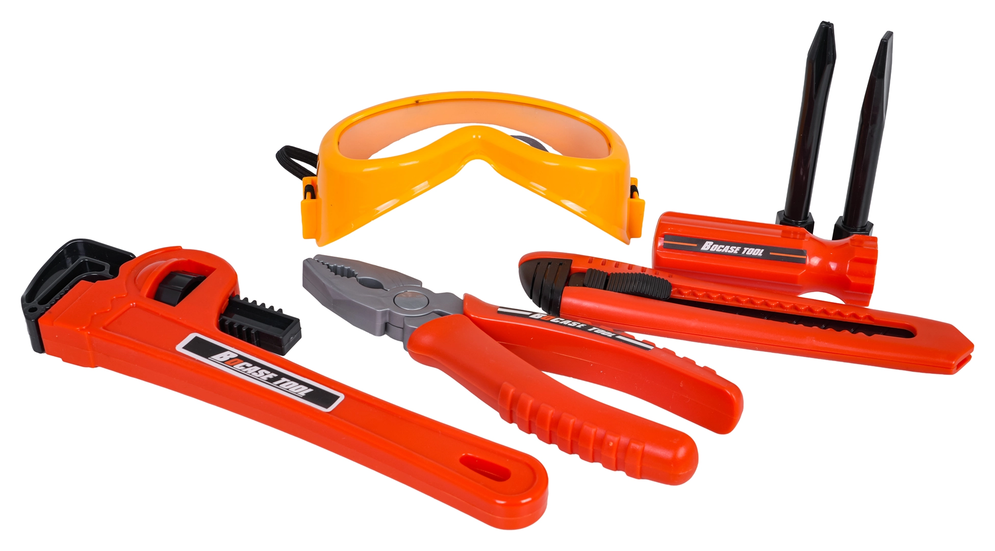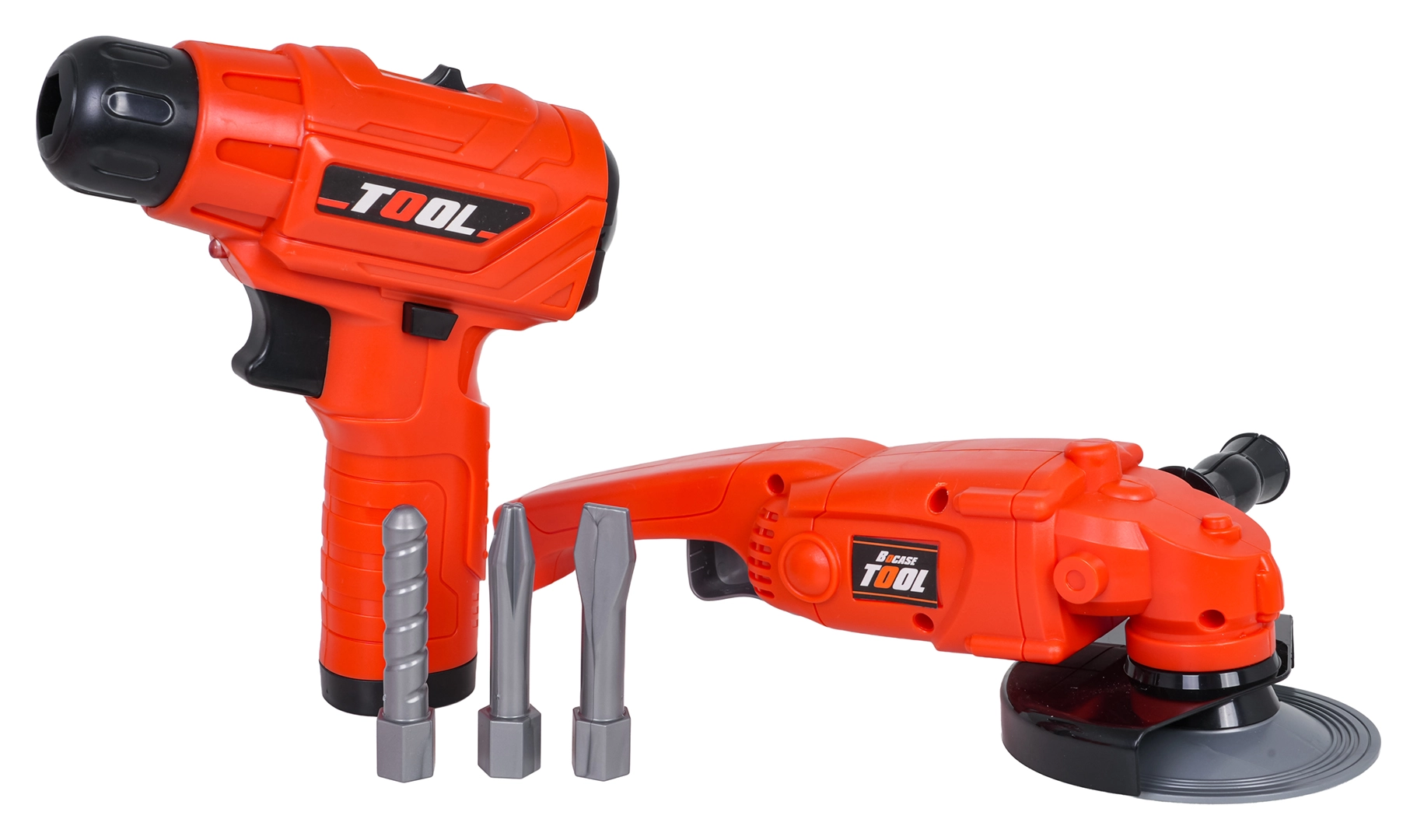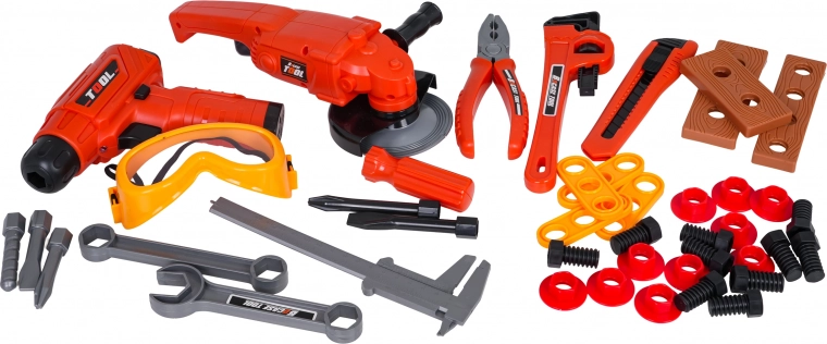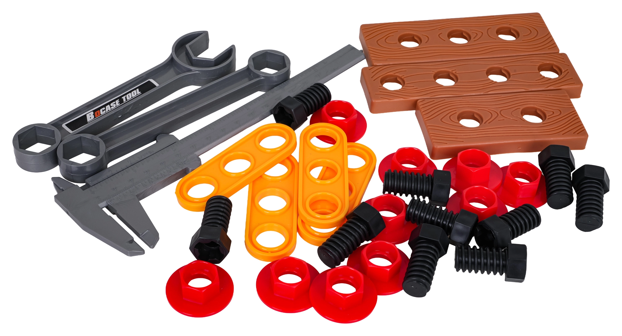Sono inclusi anche una smerigliatrice angolare con disco girevole manuale, set di chiavi, pinze, coltello, cacciavite con bit, calibro a corsoio e occhiali protettivi. I bambini possono allenare la motricità fine, la logica e l’immaginazione collegando i pezzi con viti e dadi.