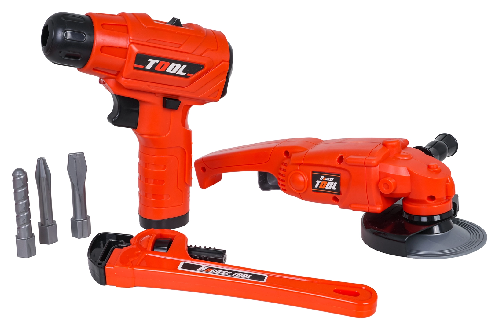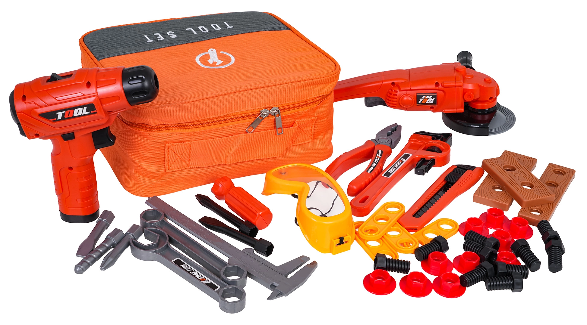 Ricco set di attrezzi per bambini con pratica borsa offre 42 pezzi per costruire in modo creativo e imparare giocando. Include trapano/avvitatore a batteria con effetti luminosi e sonori, smerigliatrice angolare con disco girevole manuale, chiavi, pinze, occhiali protettivi, viti, dadi e bit intercambiabili. Realizzato in plastica di qualità e sicura per bambini dai 3 anni.