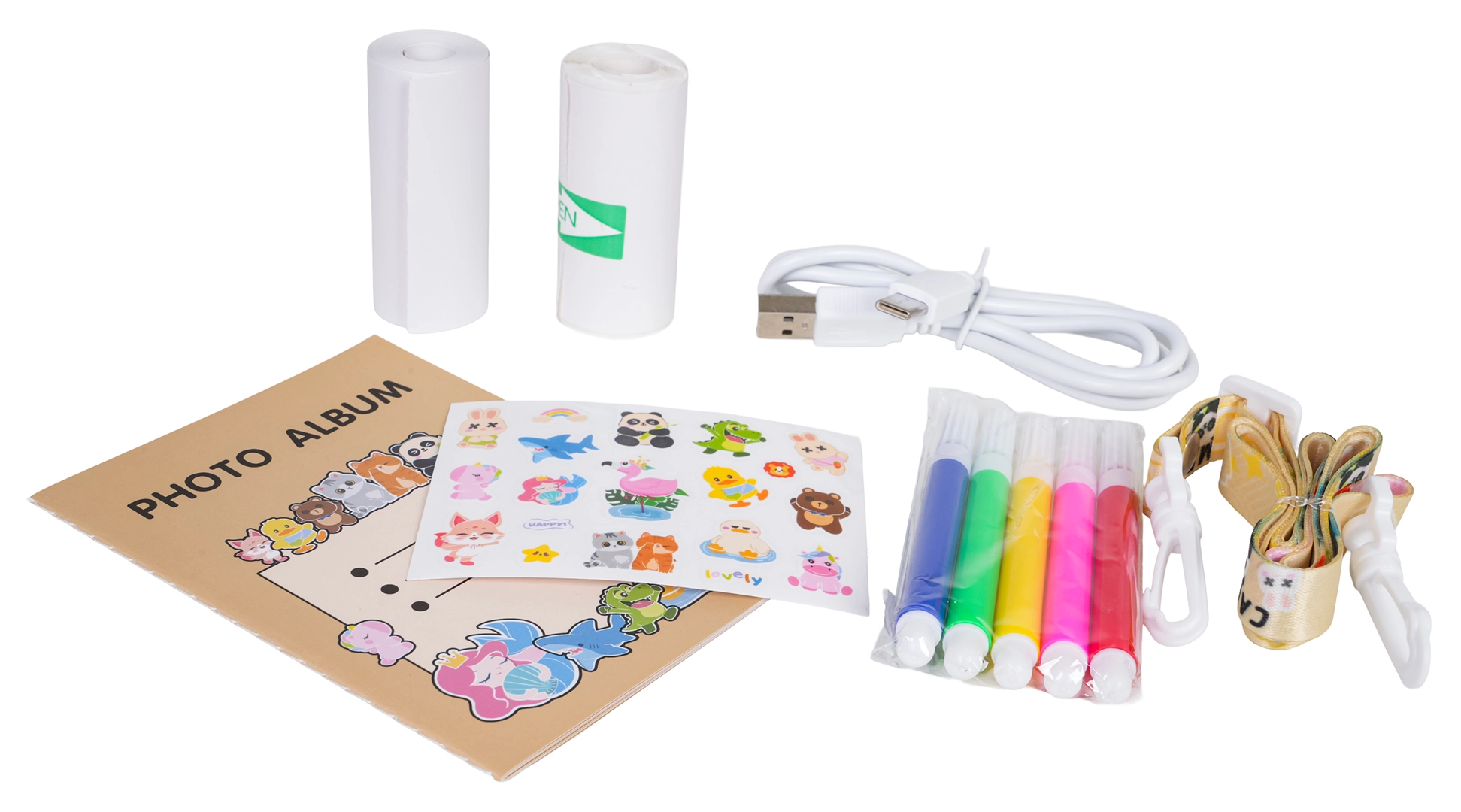 - Fotocamera con motivo paperella, custodia protettiva, 2× rotolo di carta termica, laccetto, cavo USB, album fotografico, 5 pennarelli, adesivi, sticker decorativi, manuale