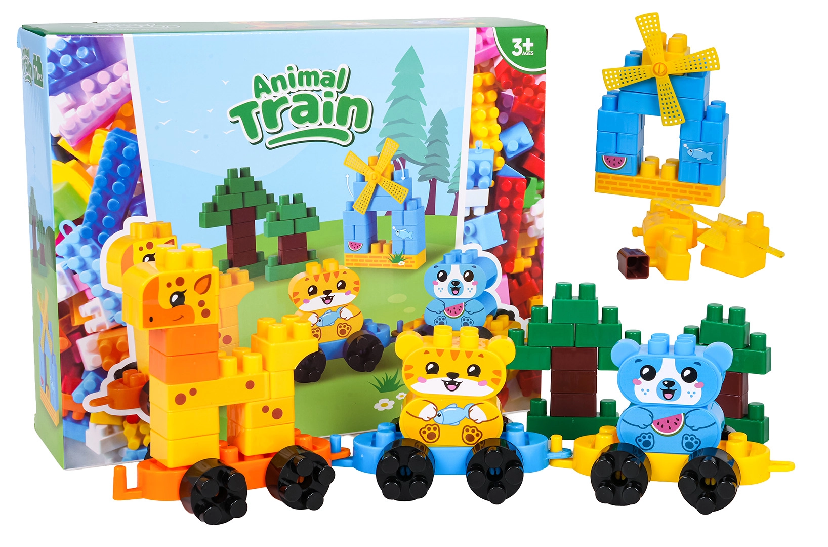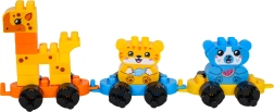 Assembla giraffa, tigre e orsetto su carrelli con ruote e collegali in un trenino colorato per ancora più divertimento.