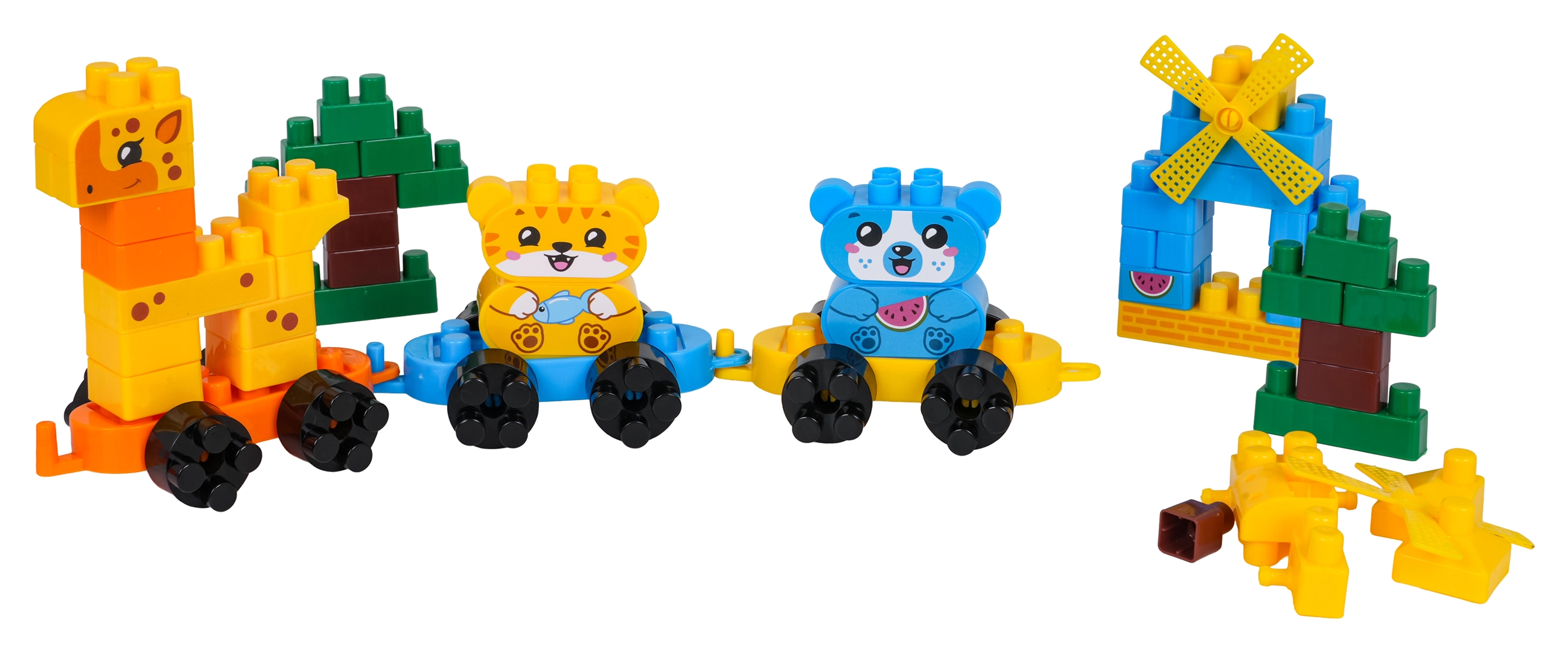 Scoprite un grande set di blocchi colorati con cui i bambini costruiscono facilmente teneri animaletti su carrelli, alberi e un piccolo mulino. Collegate i singoli vagoncini e create un trenino degli animali da tirare, che grazie alle ruote può davvero muoversi. Il set è progettato per piccoli costruttori dai 3 anni: i pezzi sono più grandi, comodi da impugnare e facili da assemblare.