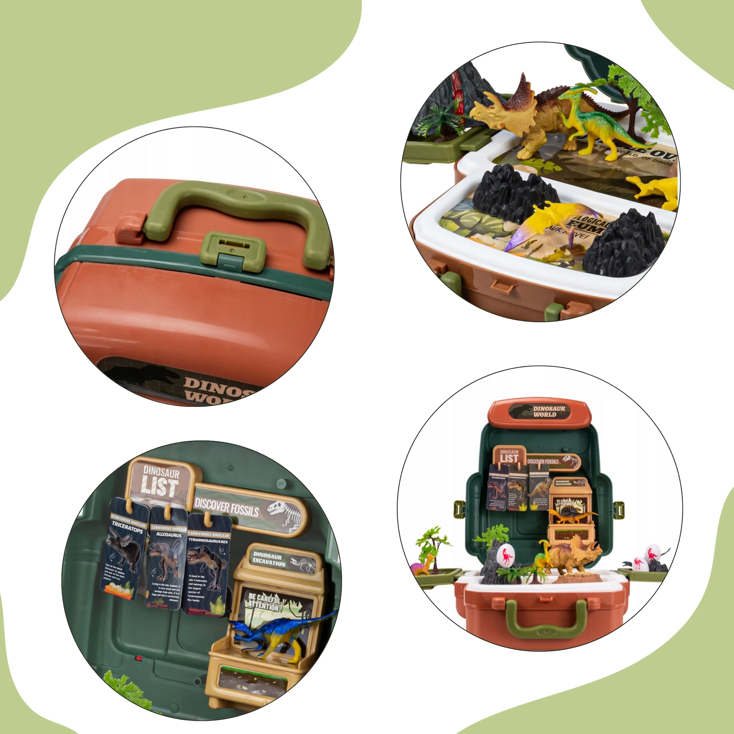 Una volta aperta, la valigetta si trasforma in un mini “Dinosaur World” con scomparti e scenografia. Si trasporta facilmente grazie alla maniglia e mantiene tutto in ordine.