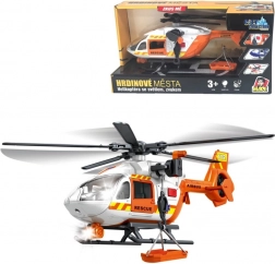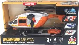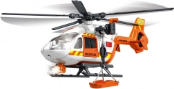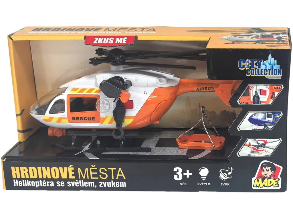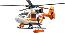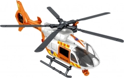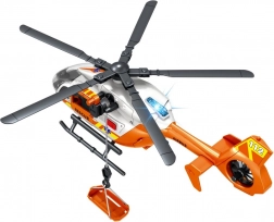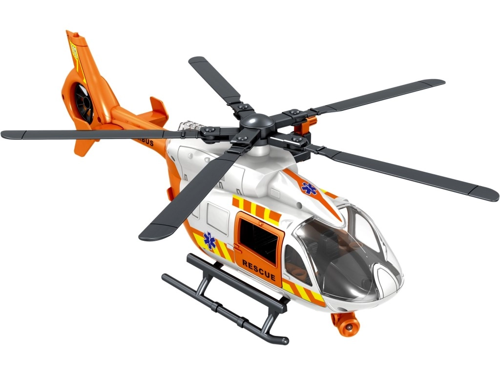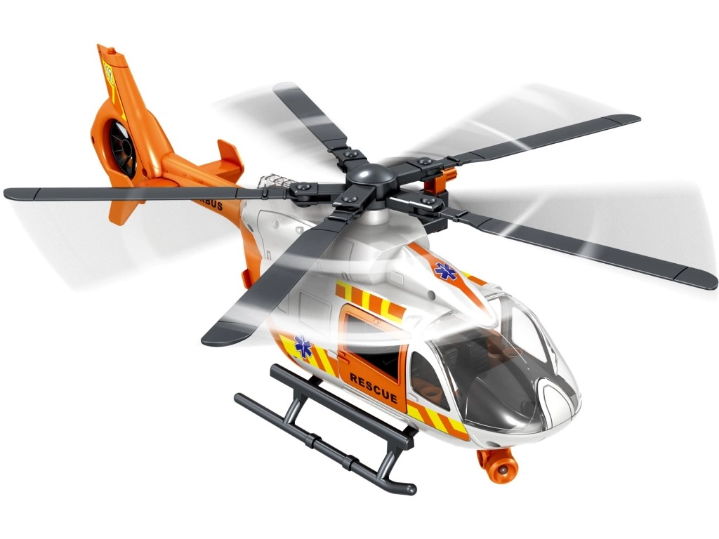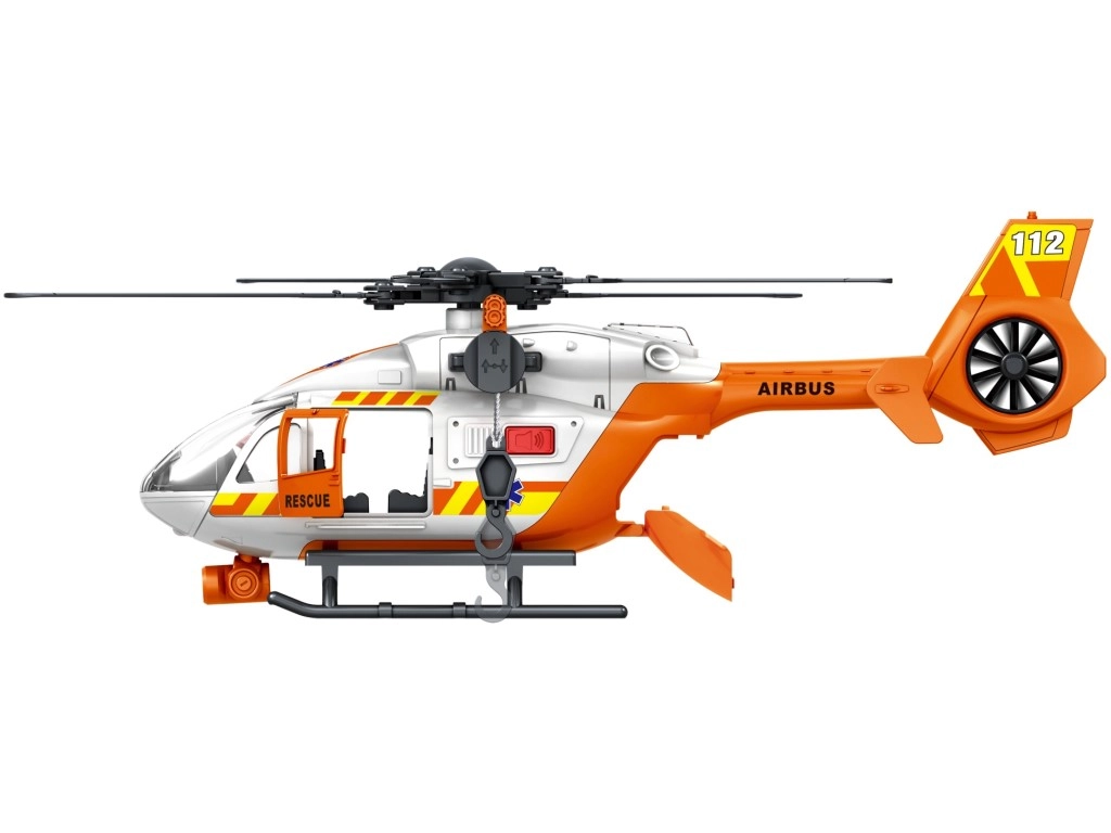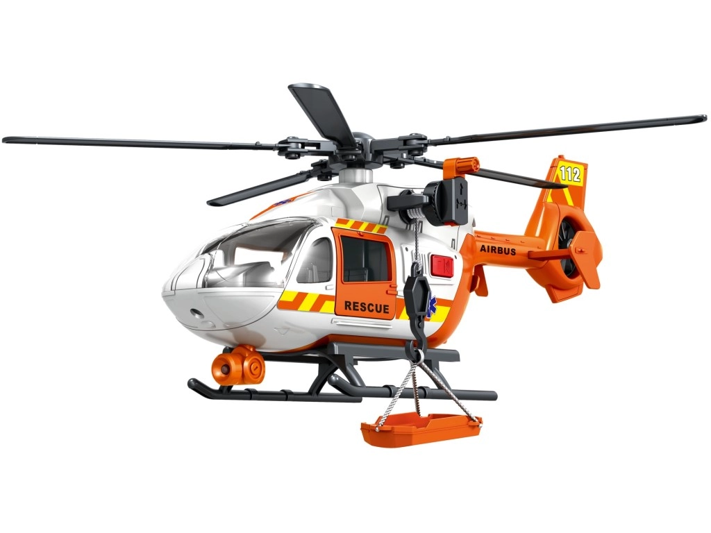 Questo elicottero di soccorso dettagliato in livrea bianco–arancione offre un divertimento autentico. Grazie ai rotori rotanti, agli sci ribaltabili e al verricello funzionante con cestello o barella, i bambini possono simulare veri interventi e il trasporto dei feriti.