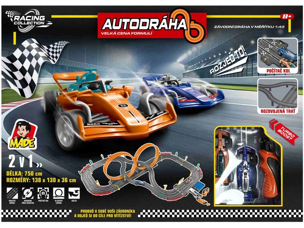 Questa pista con monoposto trasforma il soggiorno in un circuito da gara. Grazie alla struttura robusta e al layout studiato offre gare dinamiche, comandi facili e pronta all’uso grazie all’alimentatore da 12 V incluso. Le dimensioni della pista montata, 138 × 130 × 36 cm, offrono spazio sufficiente per passaggi ricchi di azione.