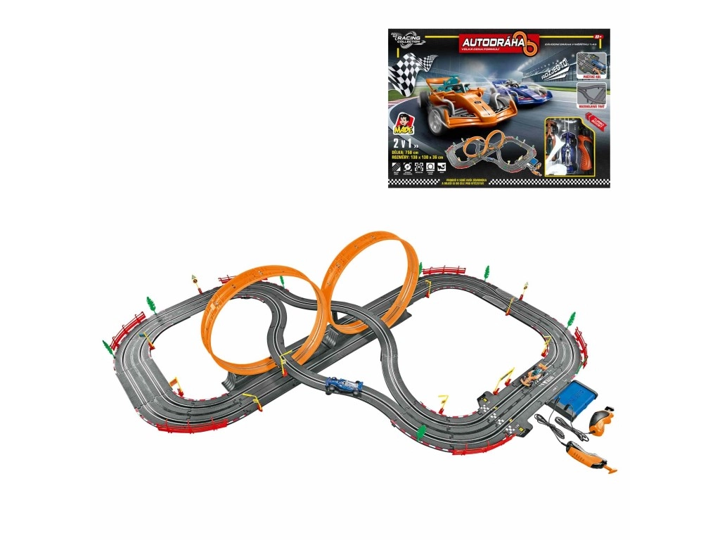 Goditi gare domestiche con una pista elettrica con monoposto lunga 7,5 metri. Pista stabile in plastica di alta qualità, comandi semplici e alimentatore 12 V incluso per corse veloci e tanto divertimento per bambini dai 3 anni.
