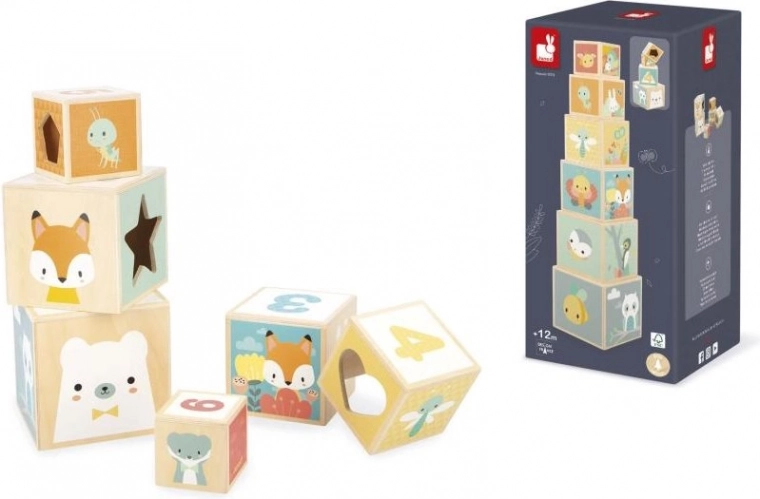 Cubi in legno lisci con simpatici animaletti e colori delicati che invitano al gioco e resistono all’uso quotidiano.