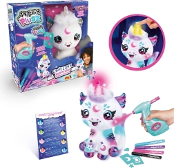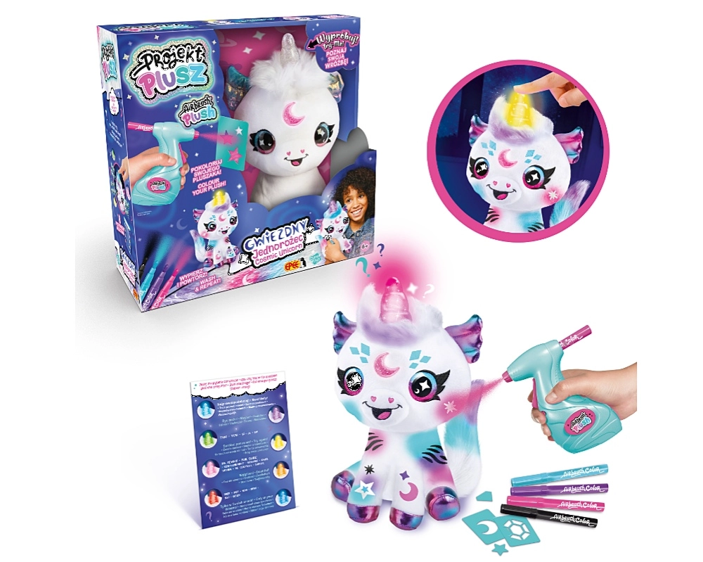 - 1× unicorno di peluche con corno luminoso, 1× aerografo, 4× pennarello, 1× paio di guanti, 120× stencil, 1× manuale d’uso