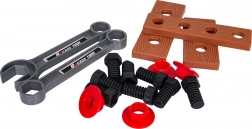 Nella confezione trovi tutto il necessario: martello, pinze, chiave a rullino, chiave regolabile, cacciavite con bit intercambiabili, viti, dadi e listelli “in legno” con fori per esercitarsi. I pezzi sono progettati per le piccole mani dei bambini con enfasi su presa confortevole e uso sicuro.