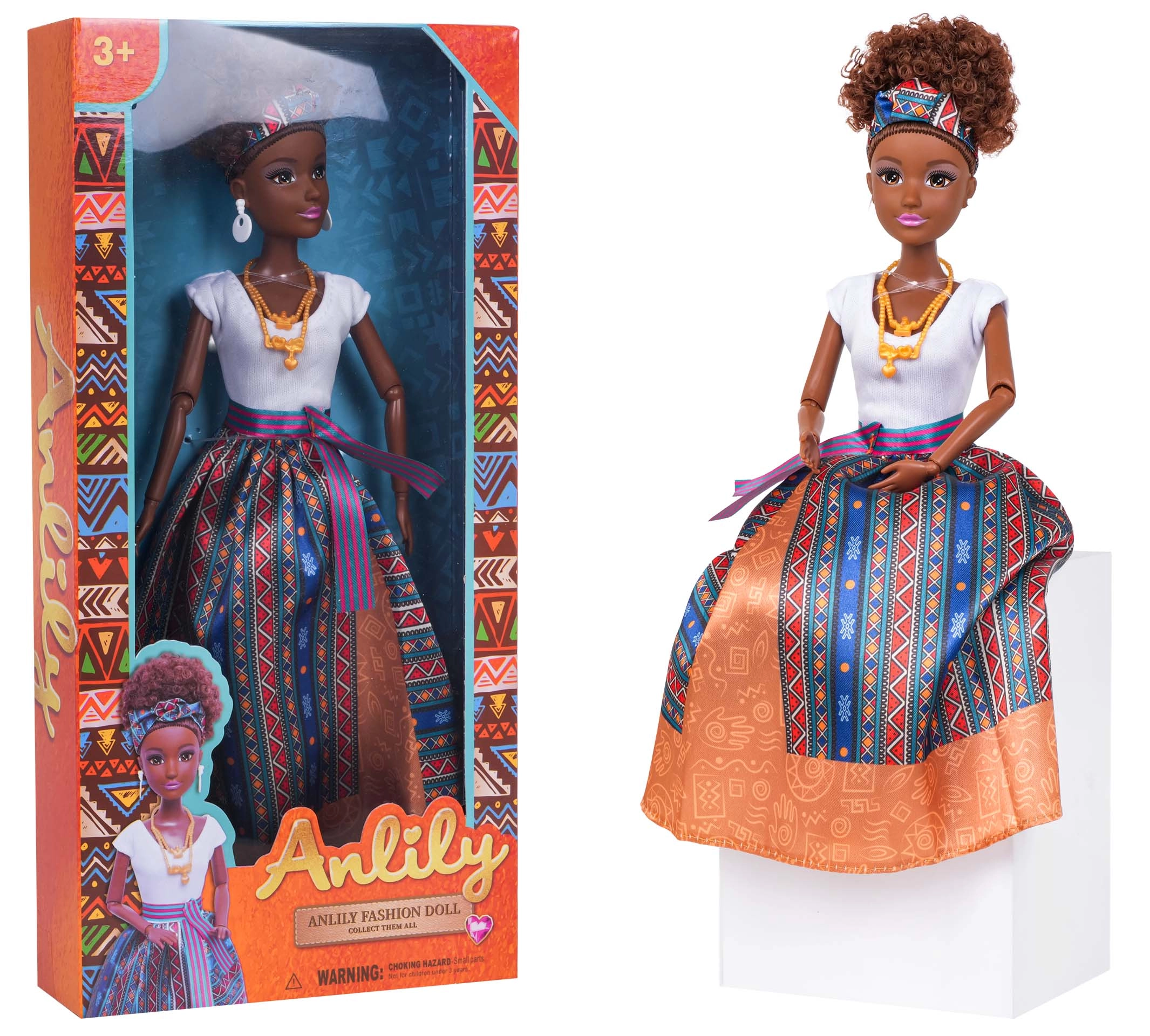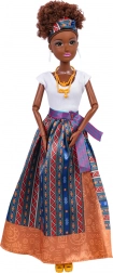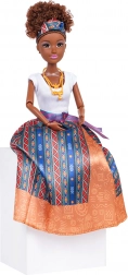 Top bianco, lunga gonna colorata, cerchietto coordinato e gioielli donano alla bambola un look deciso che i bambini adorano.