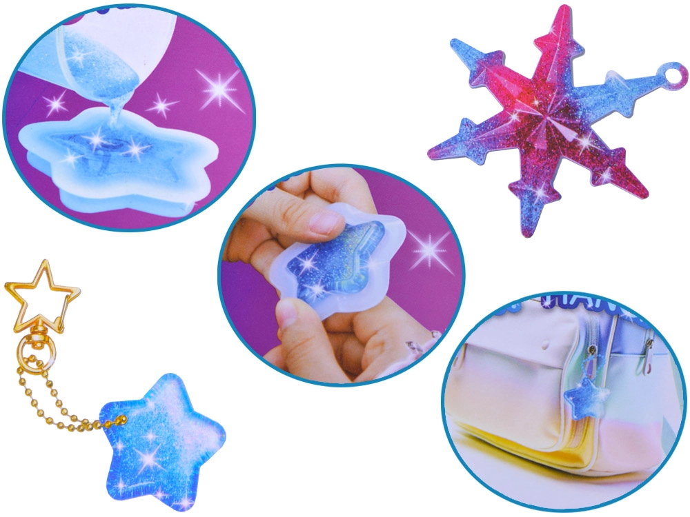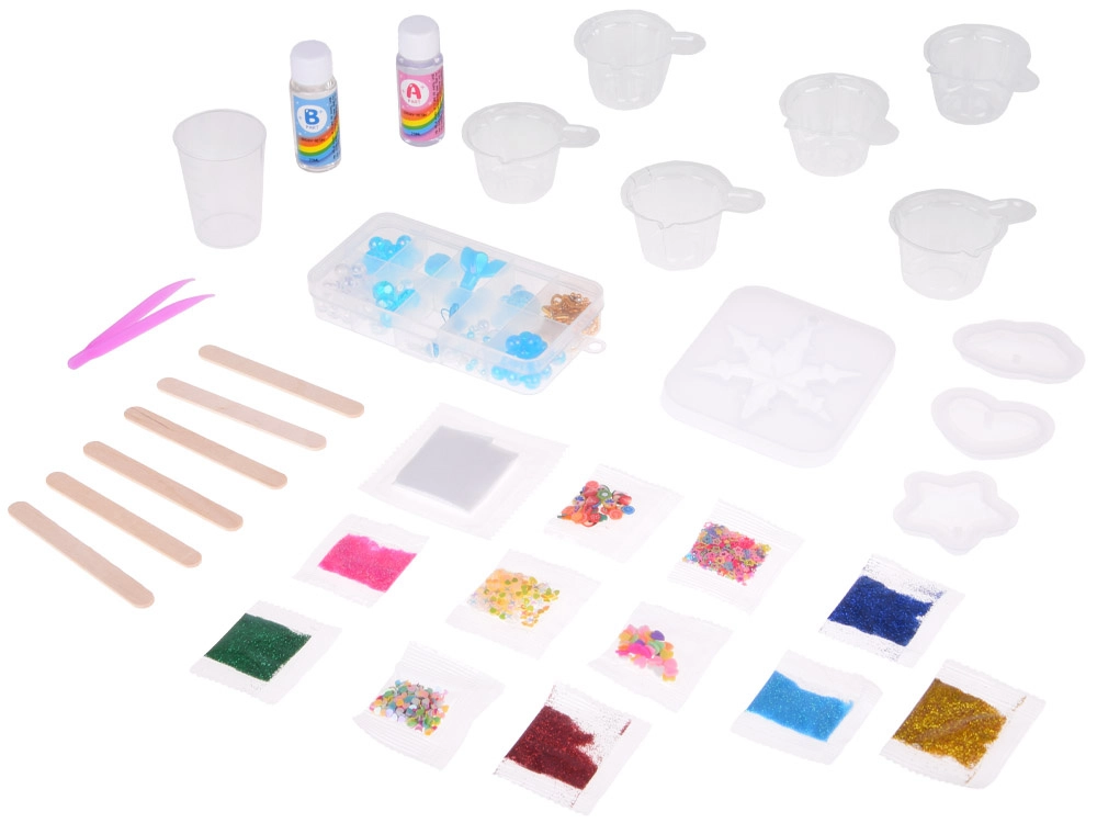 Questo kit creativo ti permette di colare con facilità decorazioni in resina cristalline nelle forme più amate – stella, nuvola e cuore. Mescola i componenti A e B in rapporto 1:1, aggiungi glitter o confetti colorati, versa negli stampi in silicone e, dopo la polimerizzazione, completa con anellini in metallo, catenine e perline. Grazie al pratico organizer avrai tutti i componenti ben in ordine e a portata di mano.