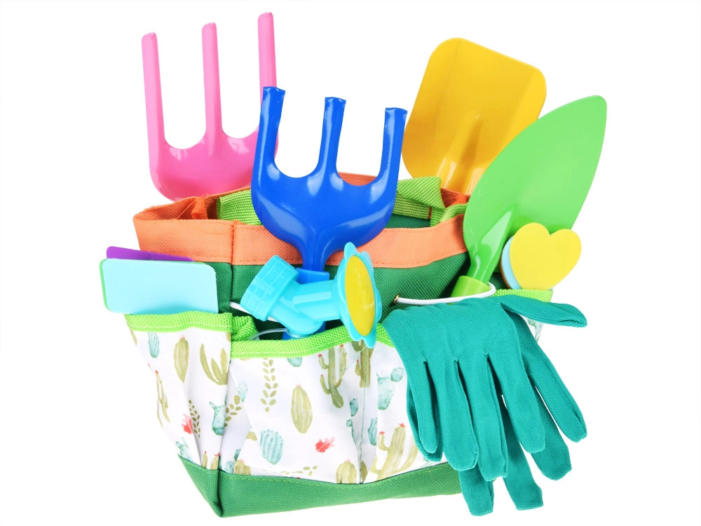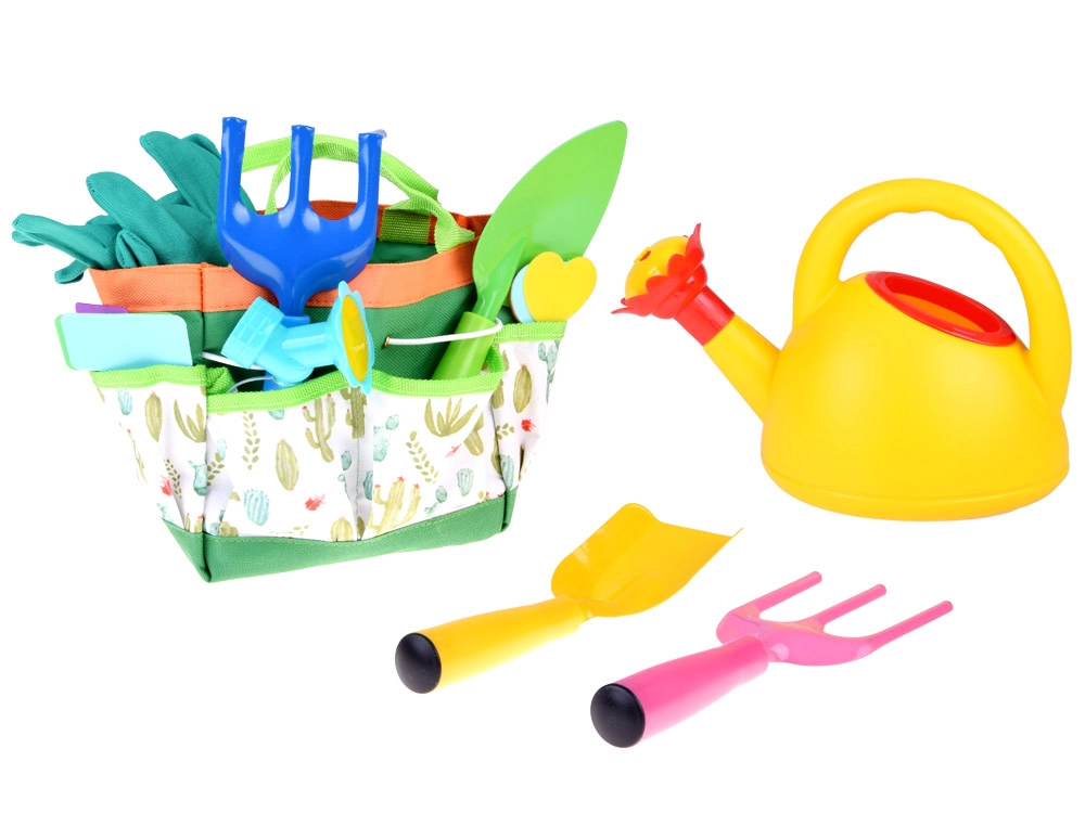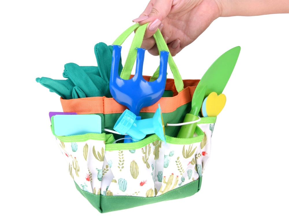Il set da giardinaggio per bambini completo con allegro motivo a cactus incoraggia i più piccoli a imparare e giocare all’aria aperta. Include una pratica borsa–organizer con tasche, attrezzi colorati per le piccole mani, annaffiatoio, grembiule, guanti, protettori e etichette colorate per piante. Ideale per scavare, smuovere il terreno, trapiantare e annaffiare e per coltivare il legame con la natura.