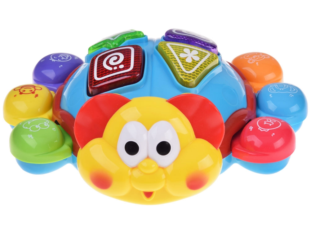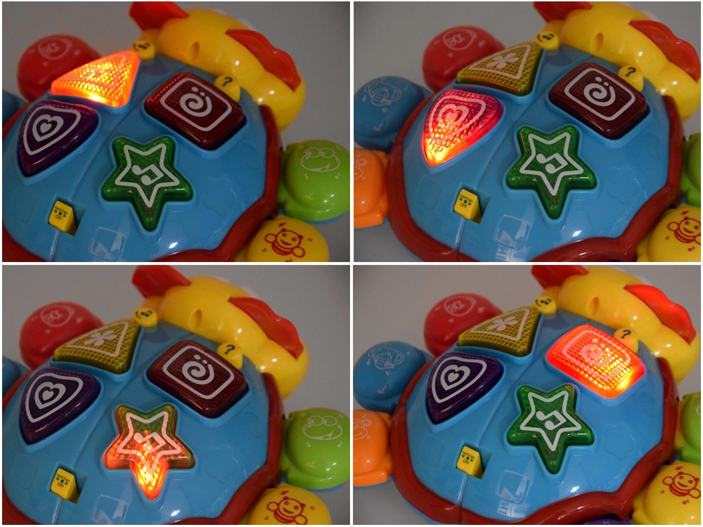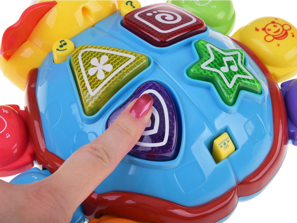 Il pulsante con la nota musicale avvia allegre melodie accompagnate da lucine lampeggianti per stimolare i sensi e aumentare il divertimento.