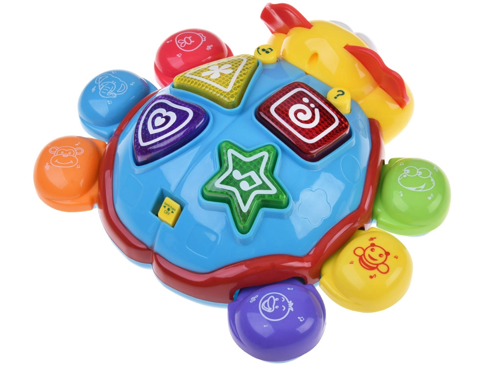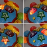 Premendo i pulsanti colorati, i bambini imparano i colori e gli animali; il pulsante quiz con il punto interrogativo propone semplici compiti.