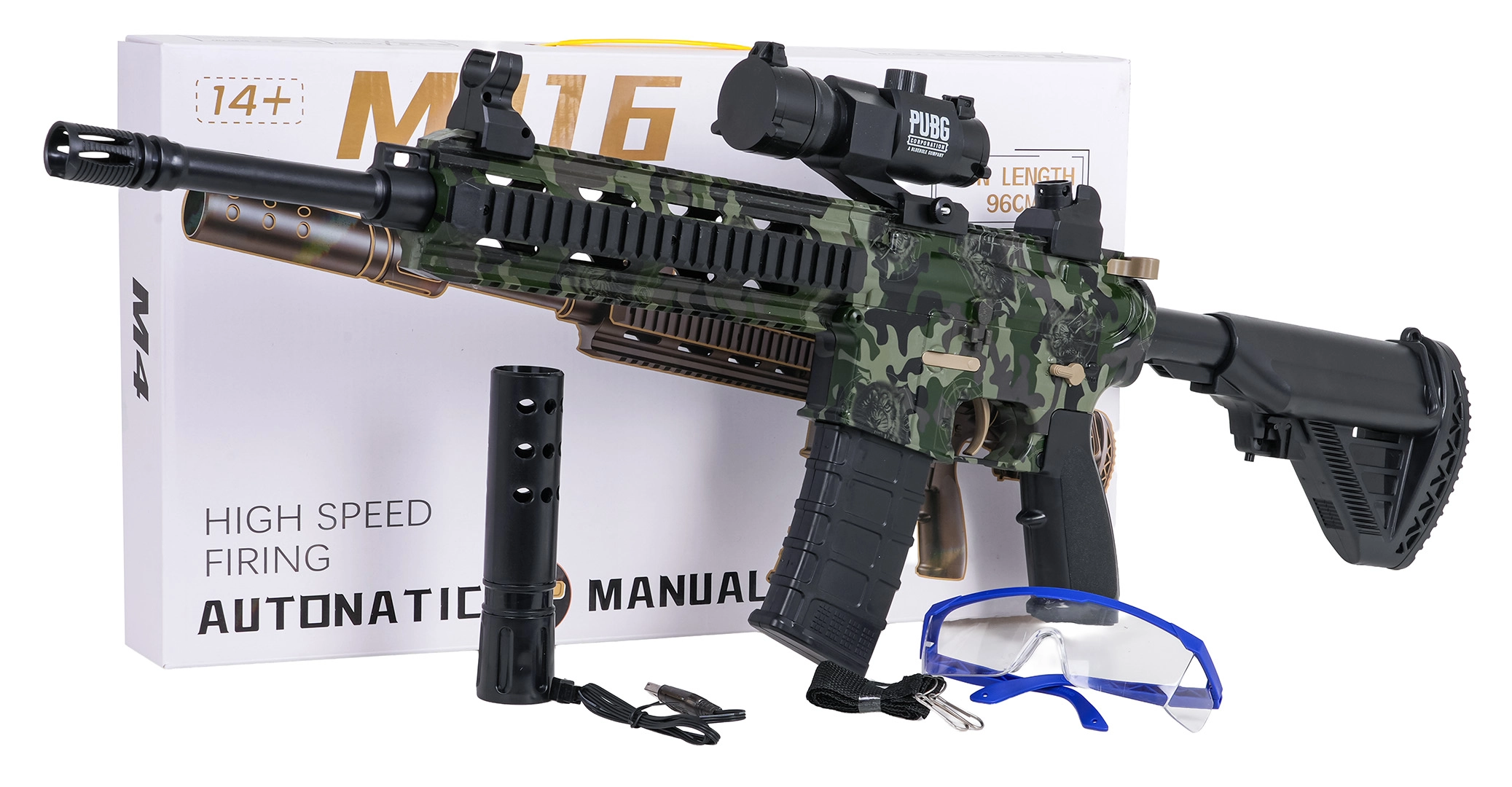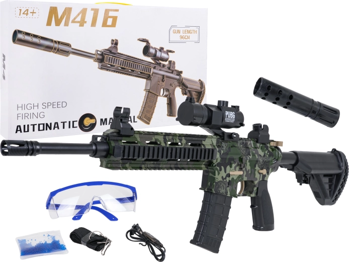 Blaster M416, caricatore, silenziatore, mirino, cavo USB, batteria 7,4 V, sacchetto con circa 500 palline da preparare, cinghia, occhiali protettivi, manuale