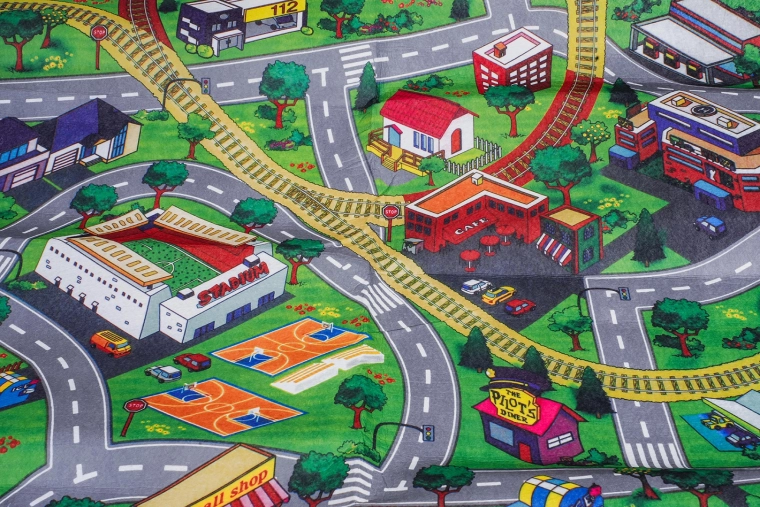 Il grande tappetino in feltro con strade amplia l’area di gioco. Nella confezione trovi 6 macchinine in metallo, segnali, barriere e adesivi.