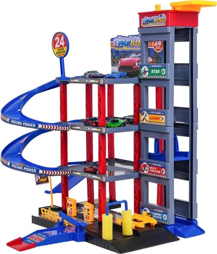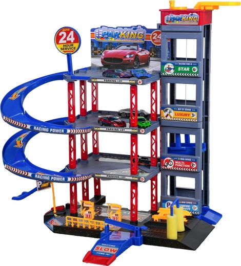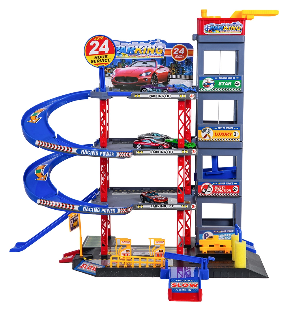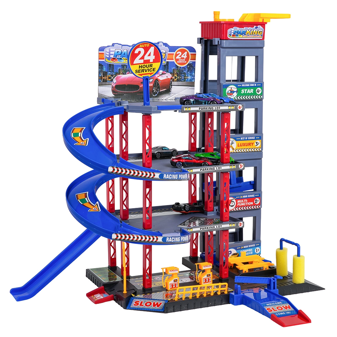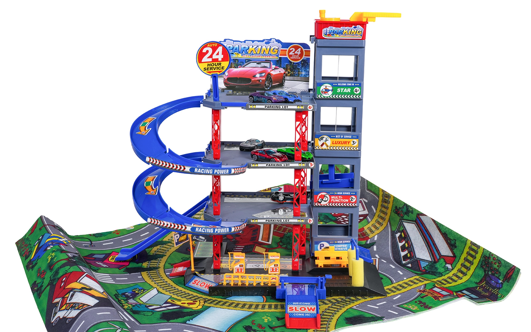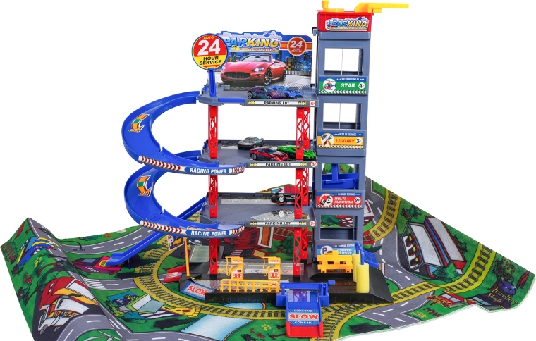 Scopri il divertimento per i piccoli piloti: robusto parcheggio multipiano con ascensore manuale, rampe a spirale e ampio tappetino da gioco con strade. Inclusi 6 macchinine in metallo, stazione di rifornimento, autolavaggio, officina sotterranea con cric e discese da gara per un gioco dinamico e lo sviluppo della motricità.