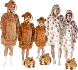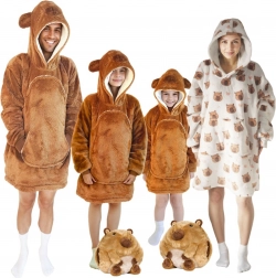 Regala ai bambini il massimo comfort con questa coperta felpa con cappuccio nello stile della tenera capibara. Combina morbido flanella e caldo sherpa fleece, ha un taglio oversize per libertà di movimento e una tasca frontale gigante per scaldare le mani. Ideale per divano, gioco e campeggio nelle giornate più fresche.