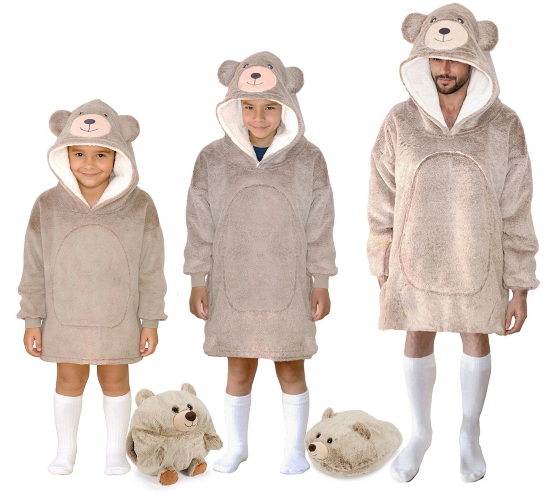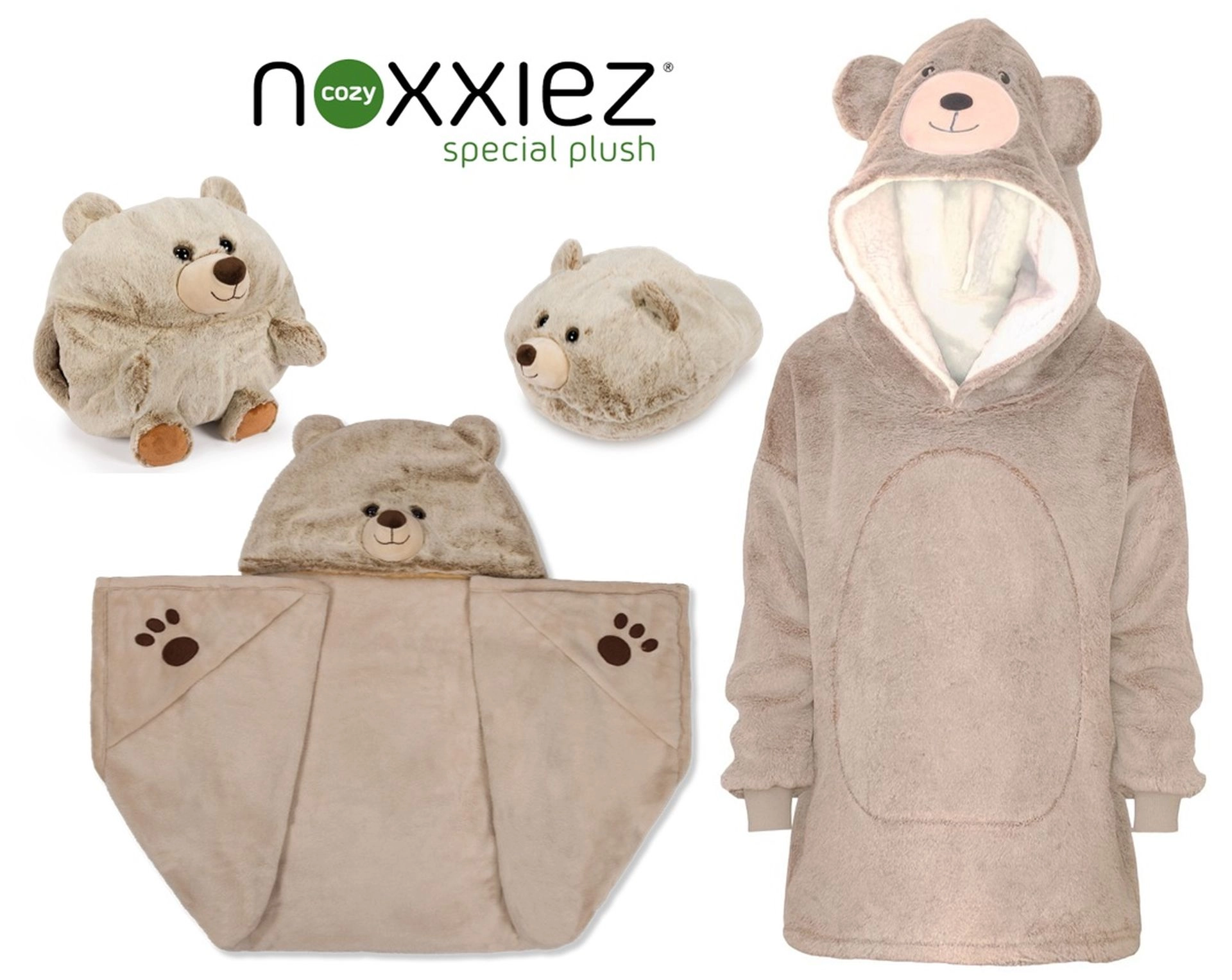 Coperta felpa da TV super confortevole con motivo orsetto di COZY NOXXIEZ scalda a casa e all’aperto. Ha un cappuccio enorme con orecchiette, una grande tasca frontale per le mani ed è realizzata in morbido flanella ultra soft e caldo pile sherpa. Il taglio oversize non limita i movimenti – ideale per il divano, il lavoro al PC, il campeggio e le serate fresche in giardino.