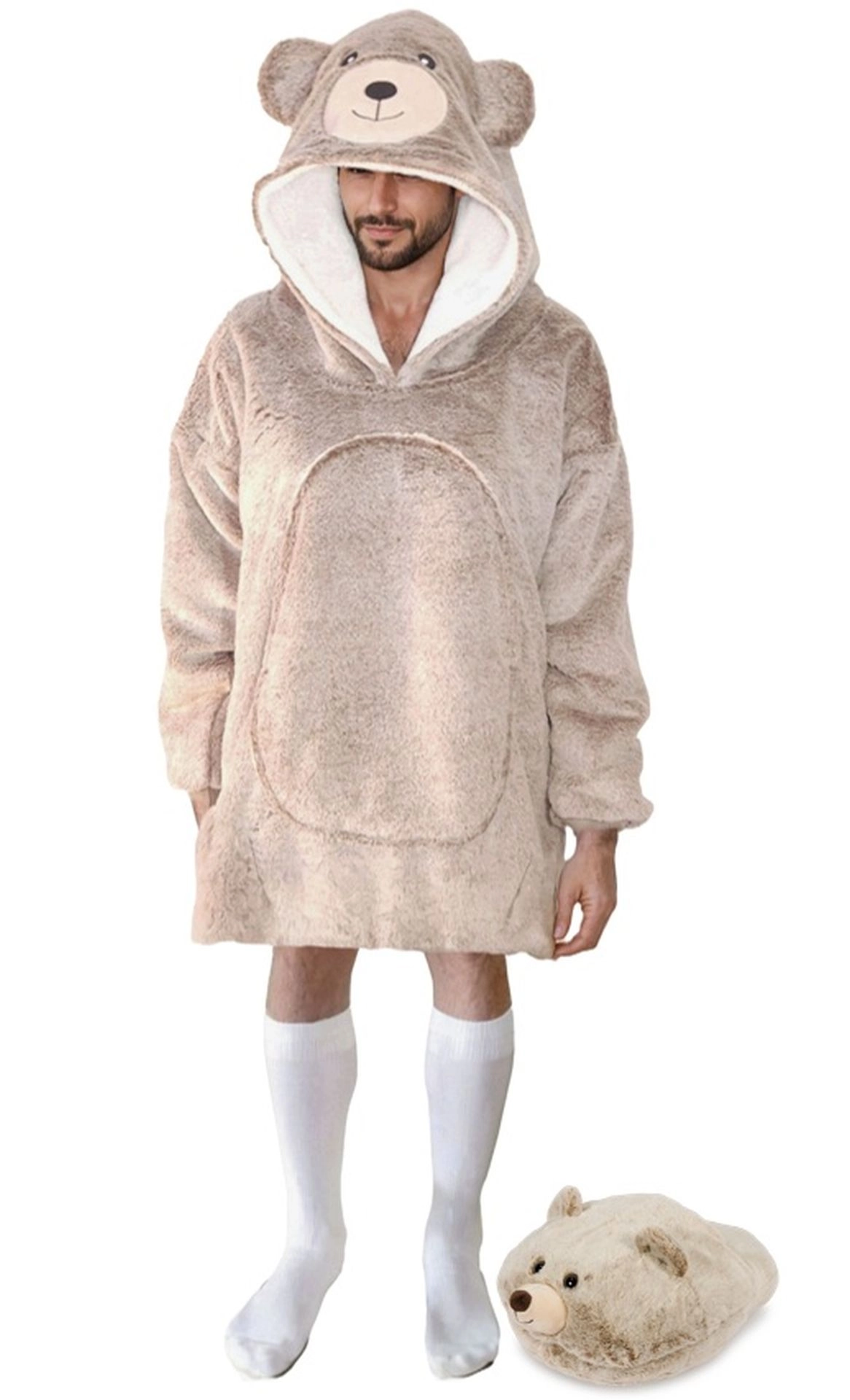 Goditi il massimo calore e comfort con la coperta indossabile con cappuccio ispirata all’orsetto. L’esterno in morbida flanella è piacevole al tatto, l’interno in pile sherpa scalda piacevolmente. Il taglio oversize si adatta alla maggior parte delle corporature, non stringe e non limita né durante il relax né in movimento.