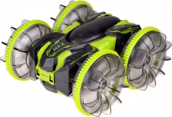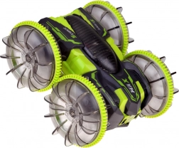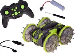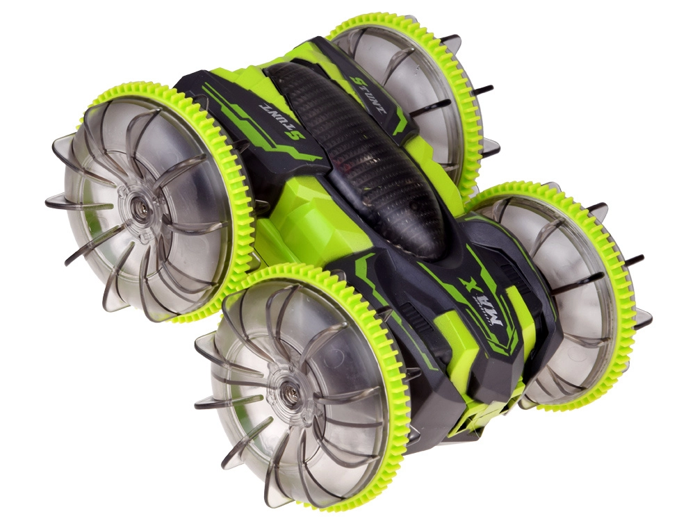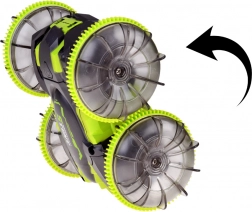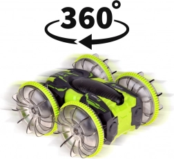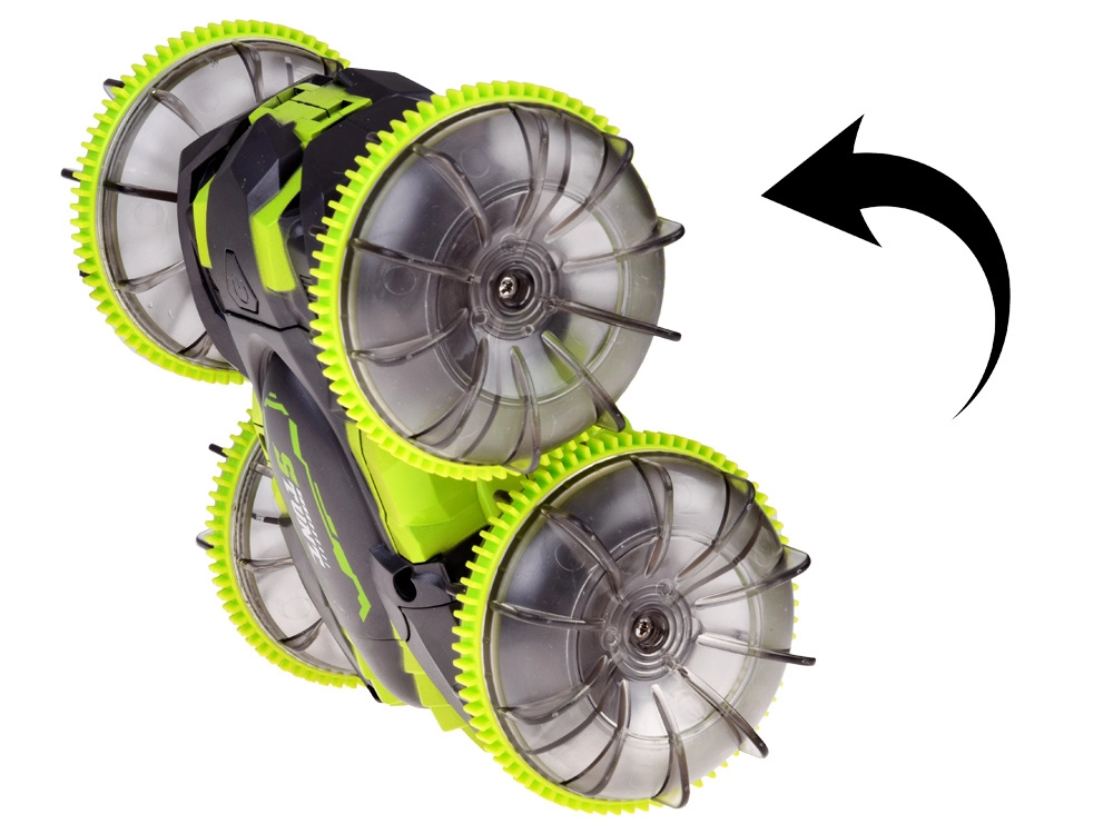 Scopri l'adrenalina con l'auto RC anfibia da stunt, pronta per erba, moquette, piastrelle e superfici d'acqua. Le grandi ruote trasparenti con battistrada pronunciato e illuminazione LED garantiscono ottima aderenza e un look scenografico anche al buio. Grazie alla rotazione a 360° continua a correre anche dopo un ribaltamento.