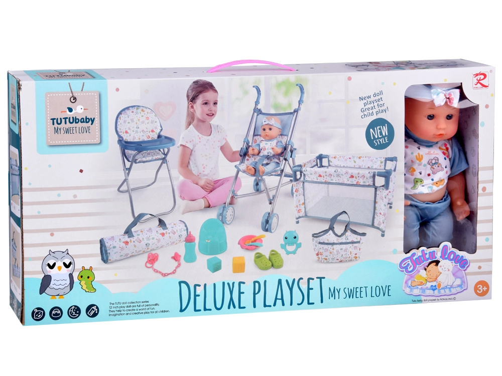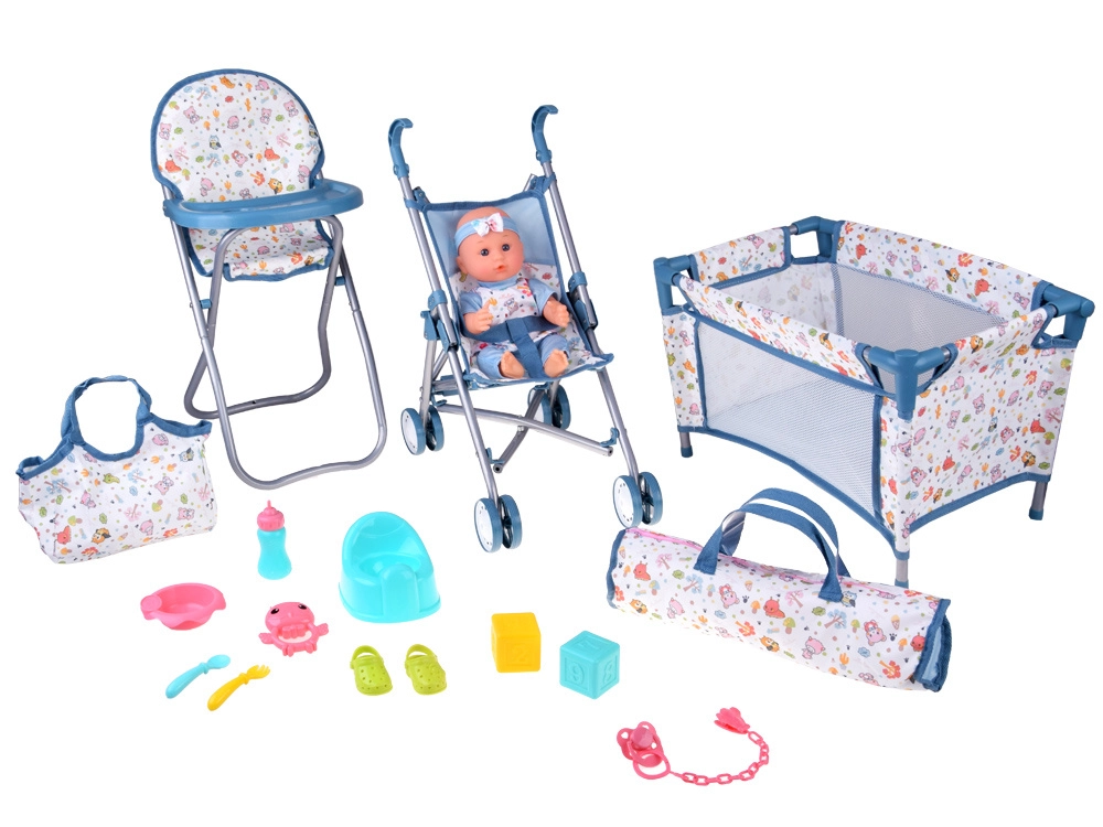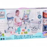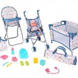 Set Deluxe bambola neonata con passeggino, lettino da viaggio, seggiolone e accessori