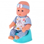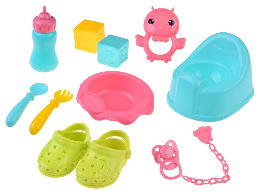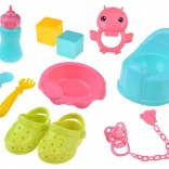 La dotazione pratica comprende un set pappa (ciotola, posate e biberon), vasino, succhietto con catenella, colorati mattoncini e un sonaglino. Il lettino da viaggio con lati in rete traspirante e borsa è ideale per giocare e riporre. Grazie ai numerosi accessori i bambini imitano facilmente la vera cura del neonato e sviluppano comunicazione e motricità fine.