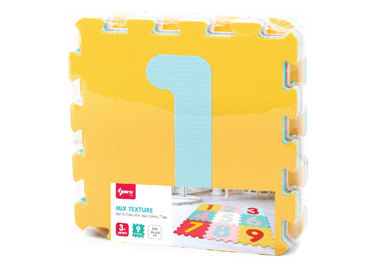 Il set di morbidi blocchi in schiuma con numeri rimovibili è ideale per camerette e angoli gioco. I singoli pezzi da 32 × 32 cm formano una superficie comoda, sicura e facile da pulire, che protegge dal freddo e dalle piccole cadute. Grazie ai numeri a contrasto, i bambini allenano in modo divertente il riconoscimento delle cifre e la coordinazione mano–occhio.