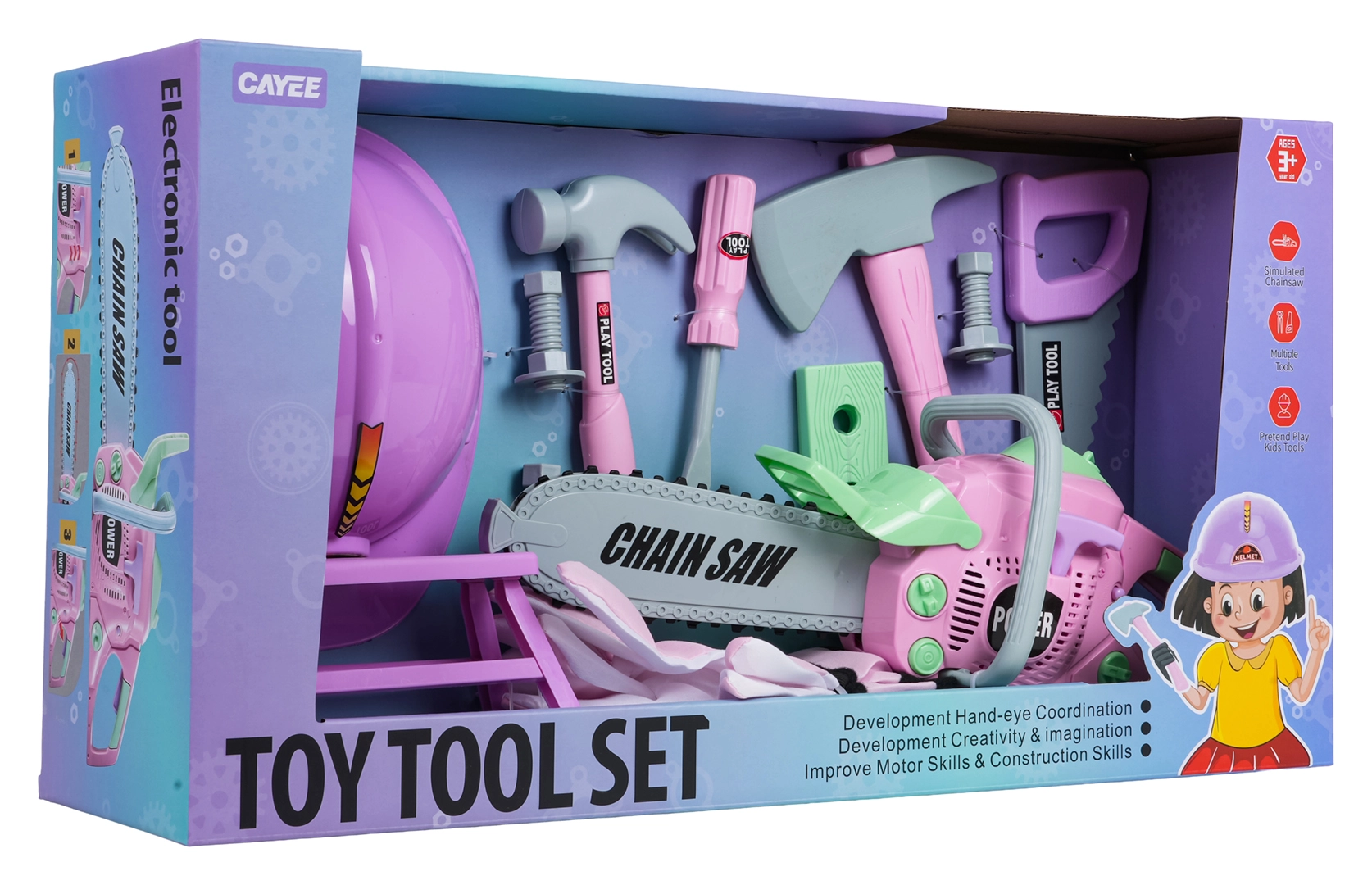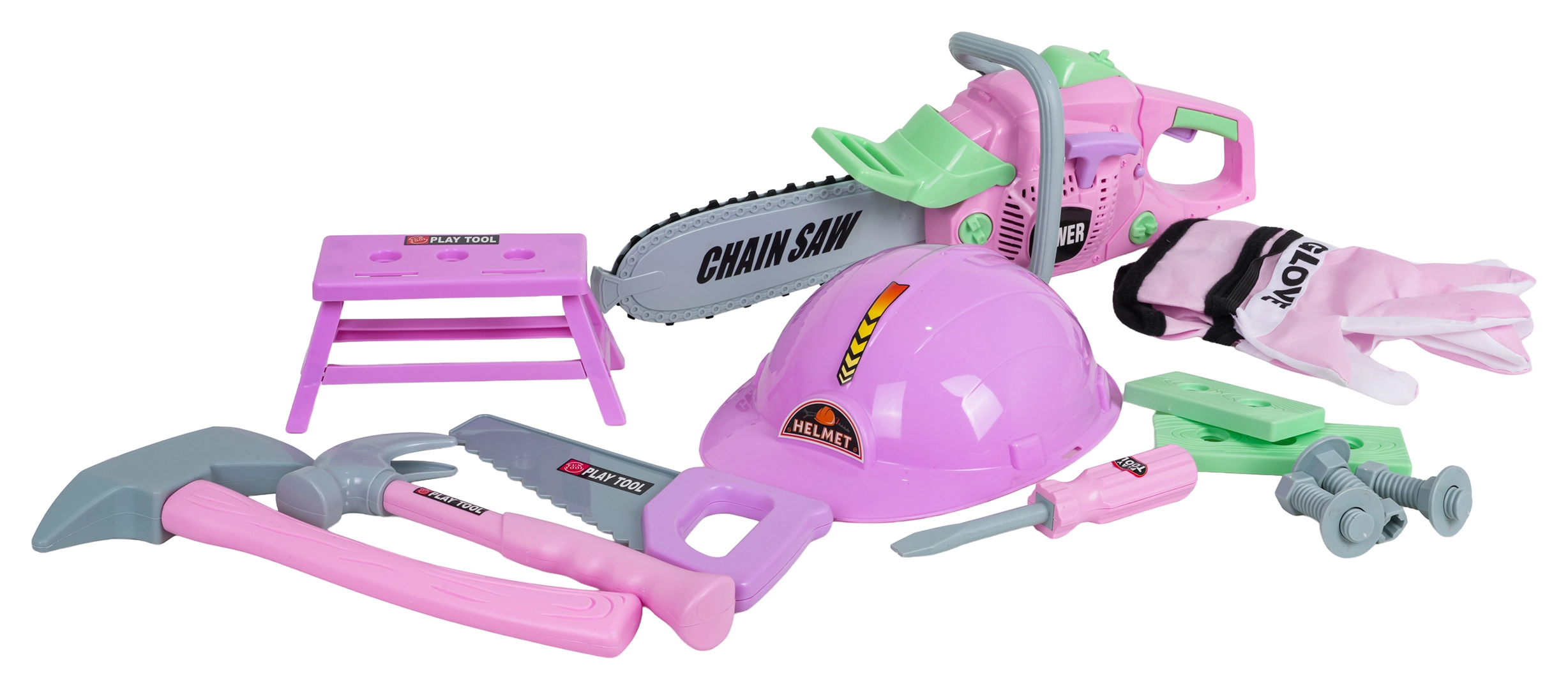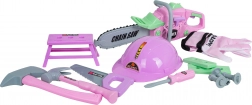 Il set di attrezzi rosa per bambini dai 3 anni farà felici i piccoli tuttofare grazie alla ricca dotazione. Include una motosega con suoni, casco protettivo e guanti, martello, sega, cacciavite, viti e un banchetto – mini officina. Realizzato in plastica di qualità, sicuro e leggero per le mani dei bambini.