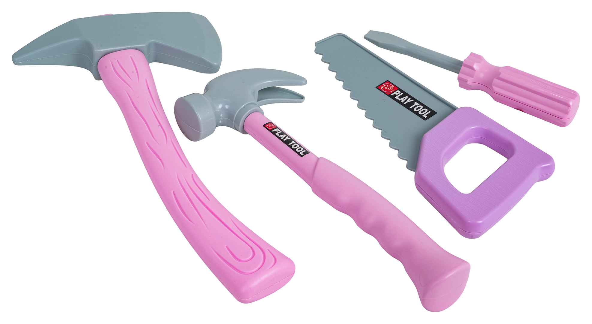 Martello, sega, cacciavite, ascia, viti, dadi e banchetto – tutto in plastica leggera per una facile presa e manipolazione da parte dei bambini.