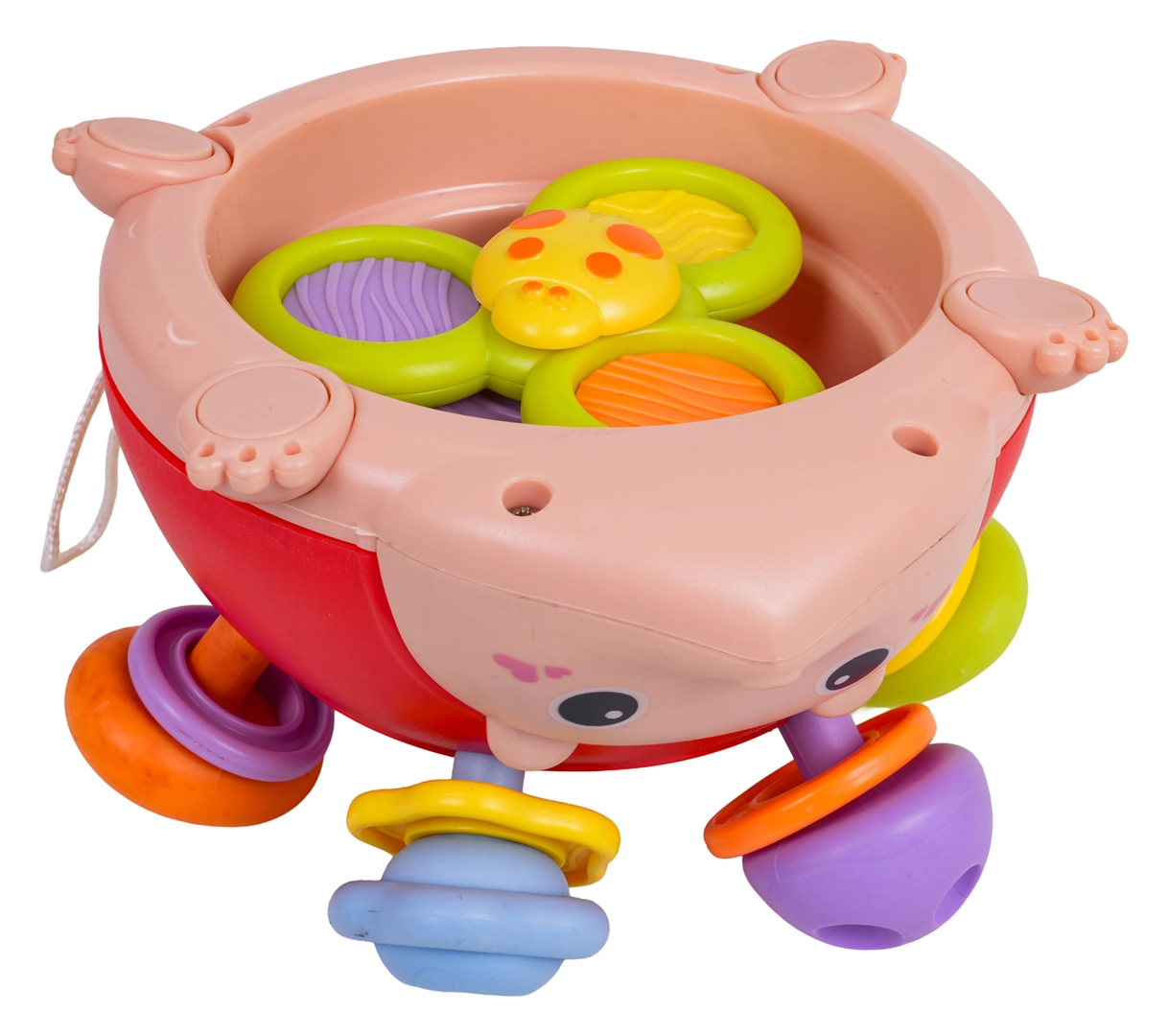 - sporgenze morbide testurizzate, anelli sonori, elemento centrale da premere/tirare, arti elastici con gommini, spinner inferiore, cordino per appenderlo