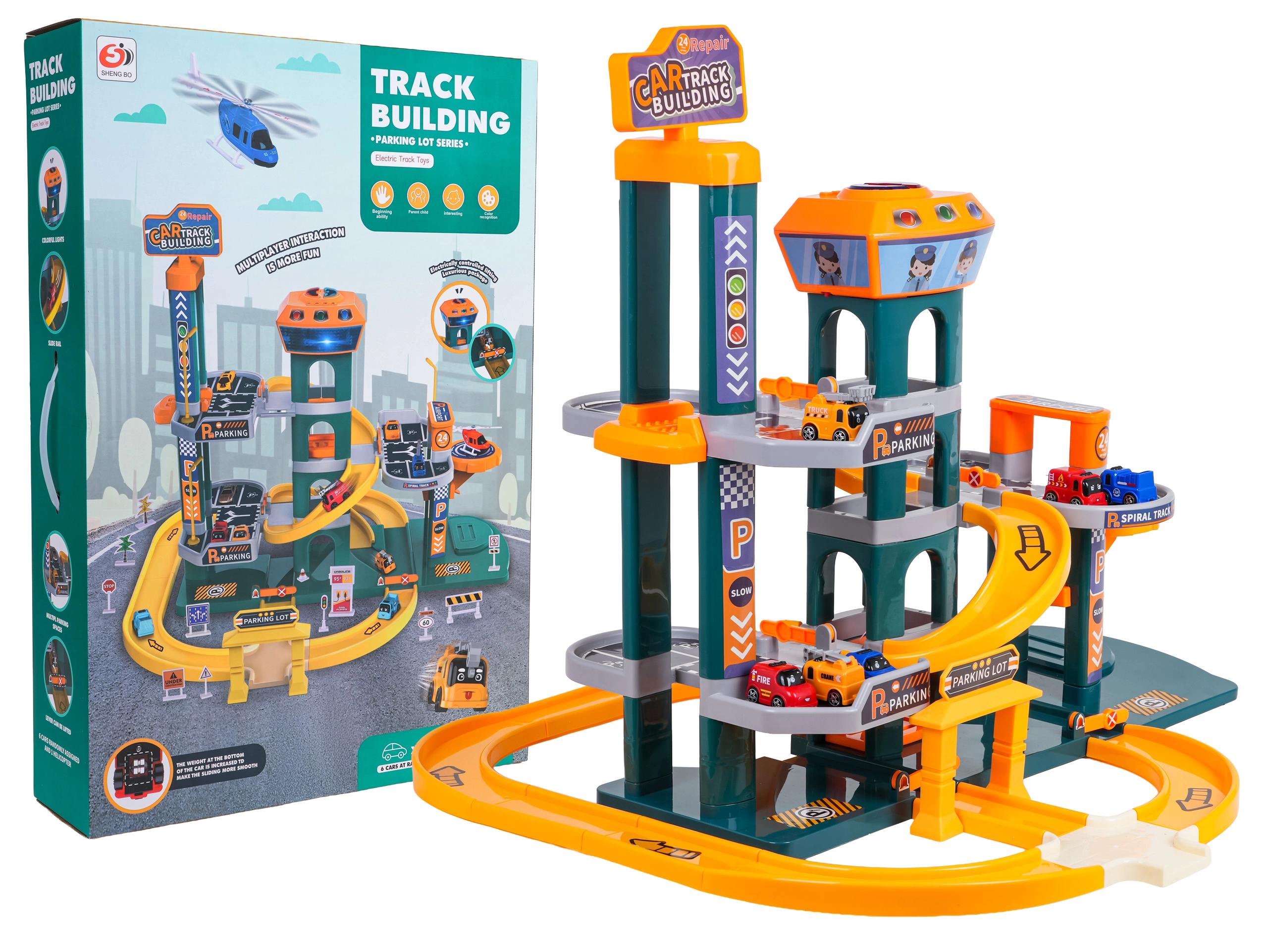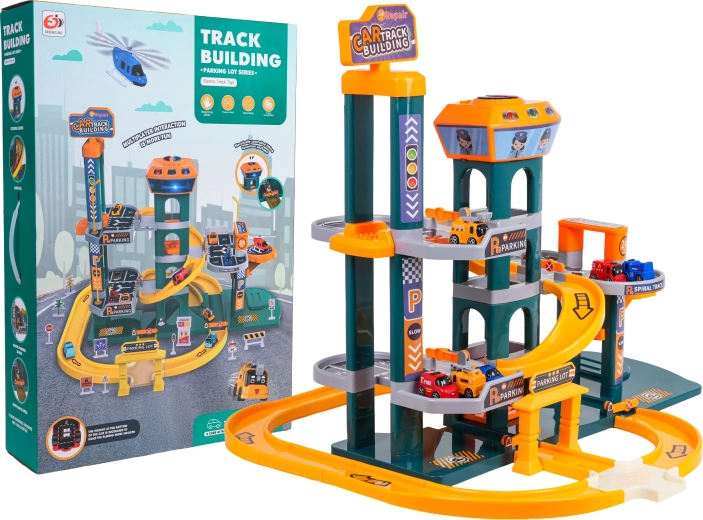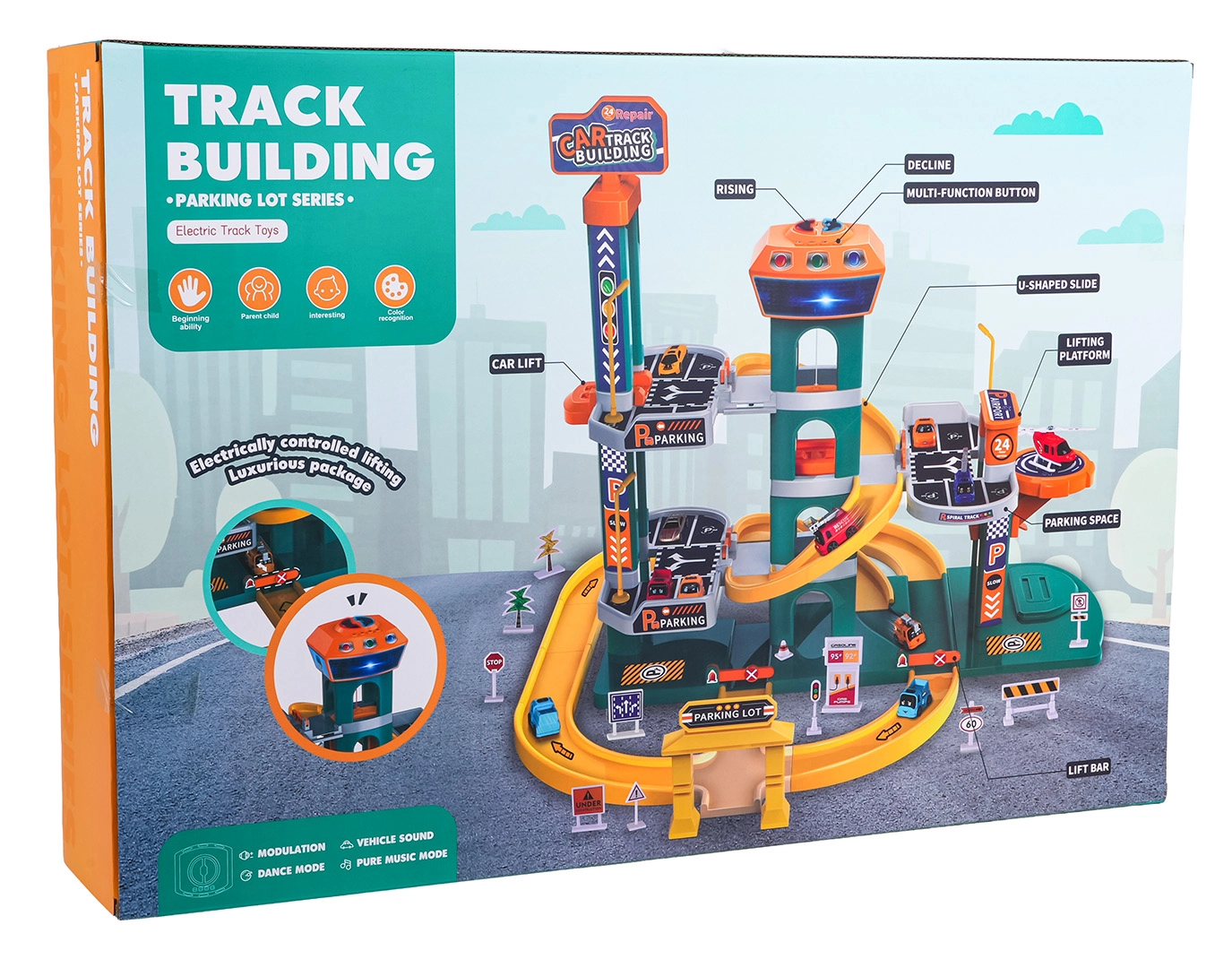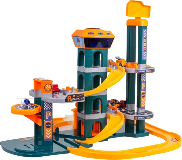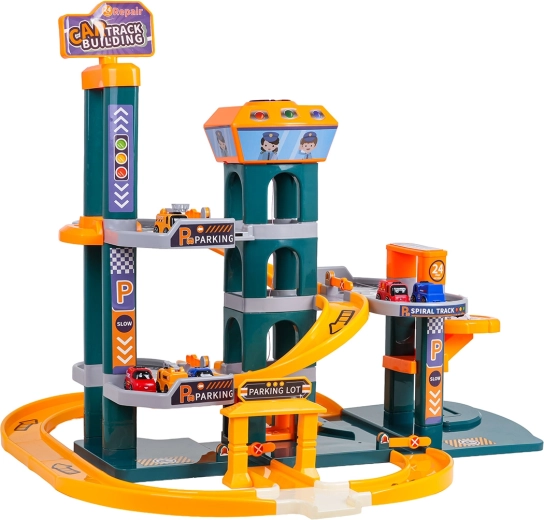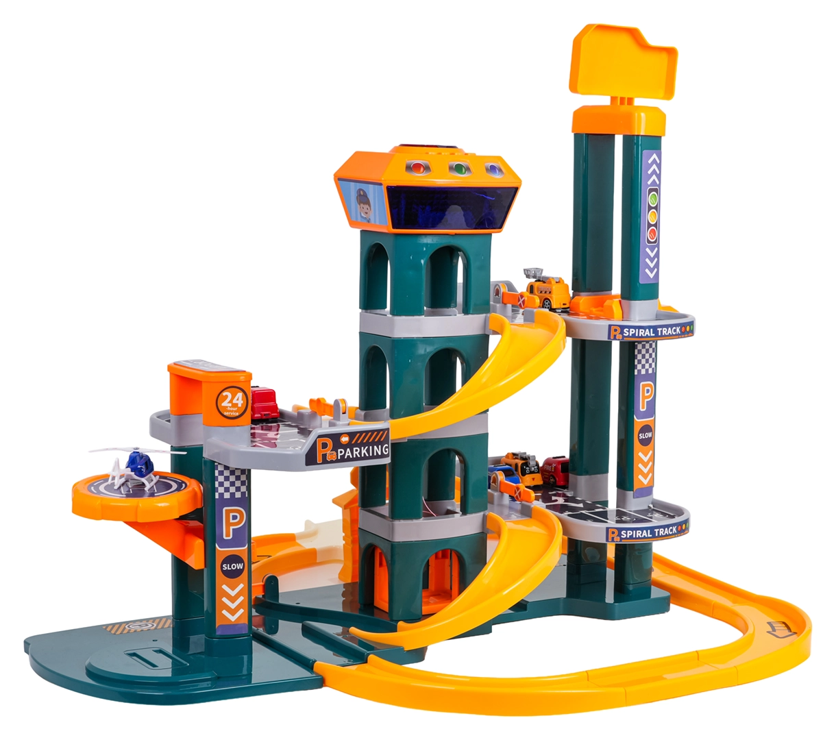 Percorsi, discese e posti auto diversificati stimolano il gioco creativo e le gare. I bambini possono alternare la corsa con l’ascensore alla discesa lungo la pista elicoidale.
