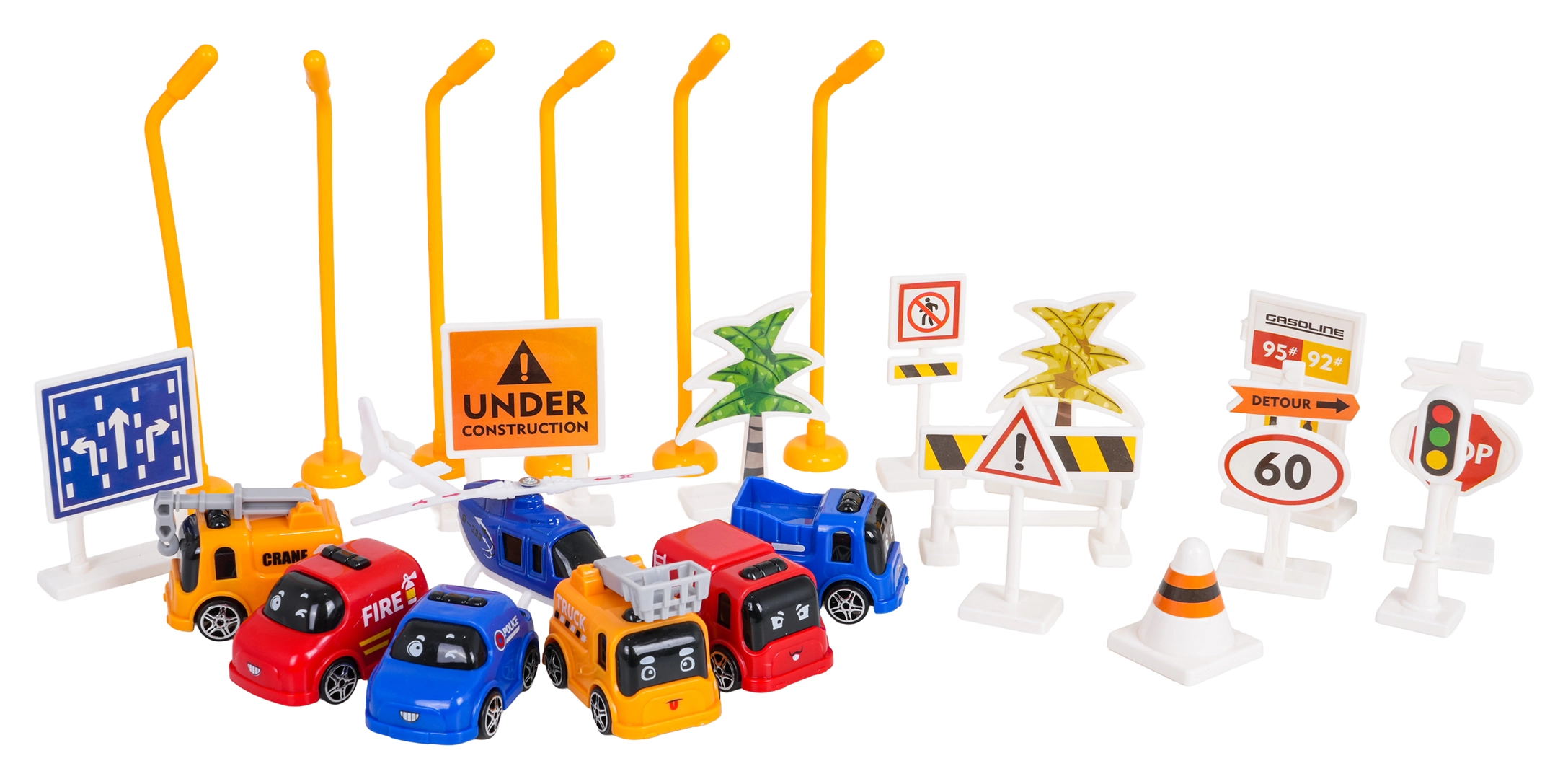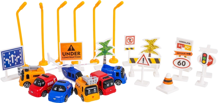 - 6× macchinina (2× gru, 2× pompieri, 2× polizia), 1× elicottero, segnali stradali, sbarre, lampioni, adesivi decorativi
