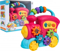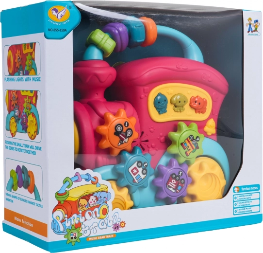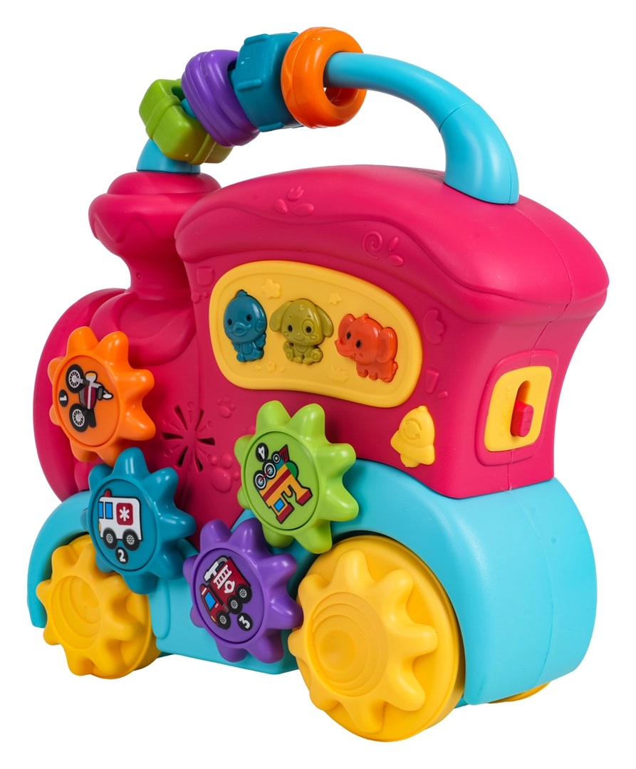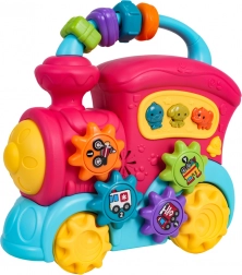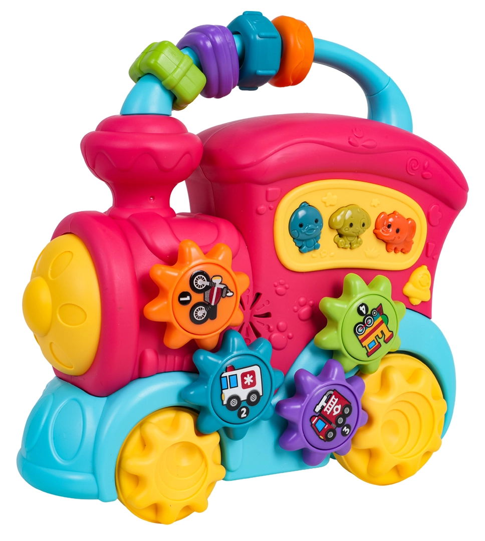 Questo colorato trenino in plastica di qualità entusiasmerà i piccoli esploratori con numerosi elementi interattivi. Sul tetto trovi perline sensoriali, sul lato ingranaggi con immagini e pulsanti con animaletti che, se premuti, riproducono i suoni di anatra, cane o elefante, allegri campanelli e melodie. Spostando il trenino si mettono in moto le ruote e il meccanismo a ingranaggi emette un piacevole tintinnio, il faro anteriore si accende e il bambino è così motivato a esplorare ancora di più.