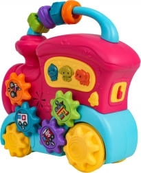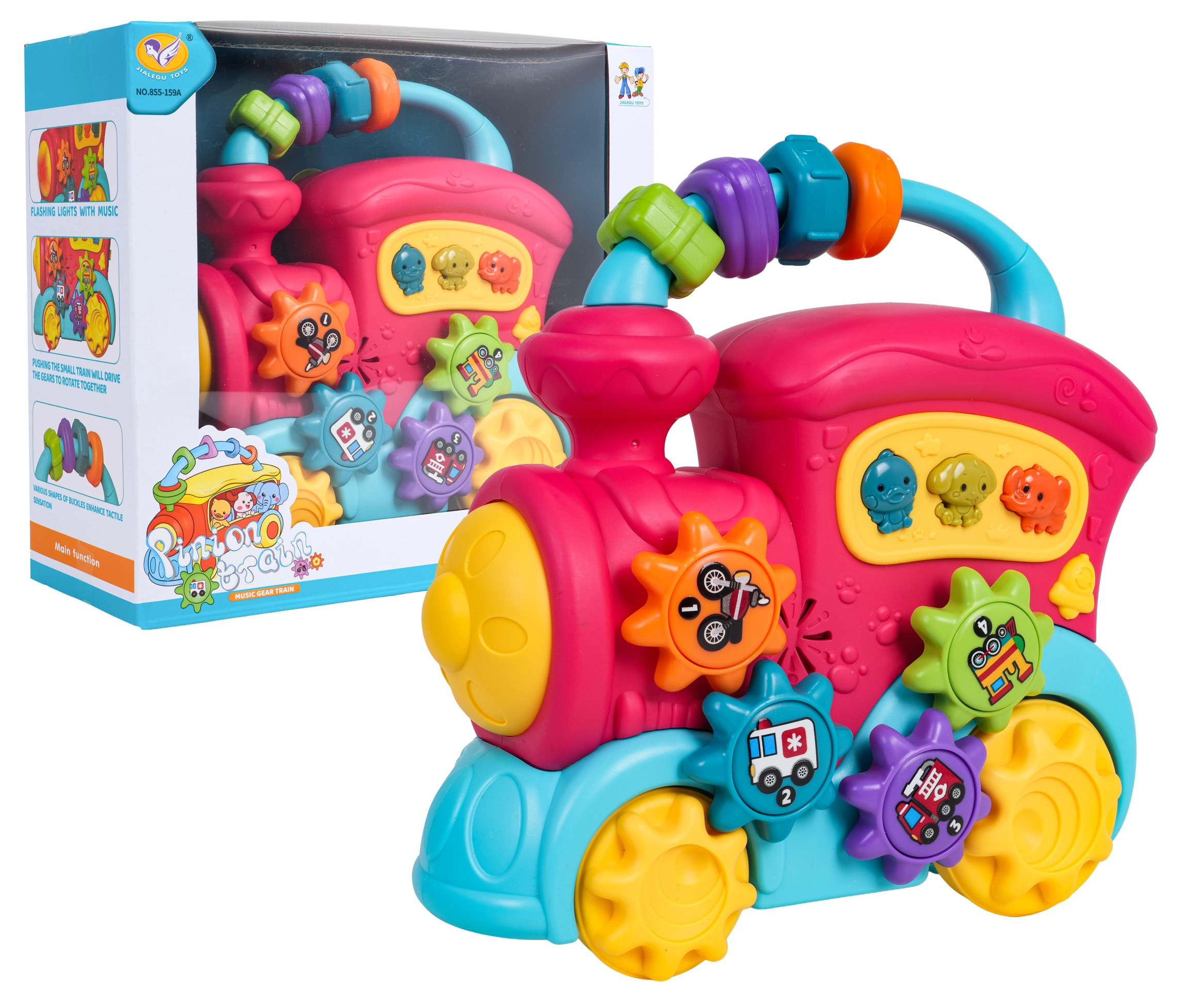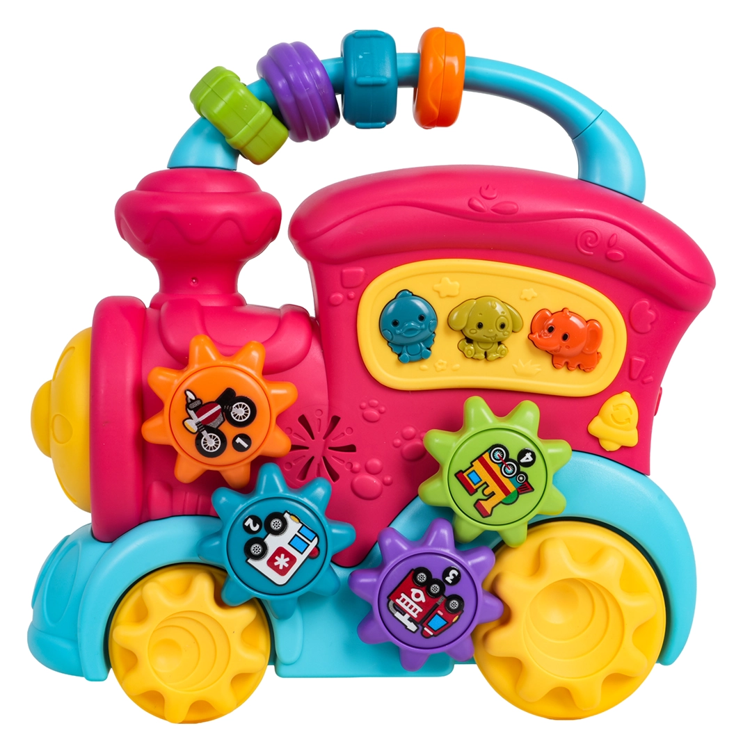 Ingranaggi rotanti con immagini e pulsanti con animaletti sviluppano la motricità fine e insegnano ai bambini le relazioni di causa–effetto.