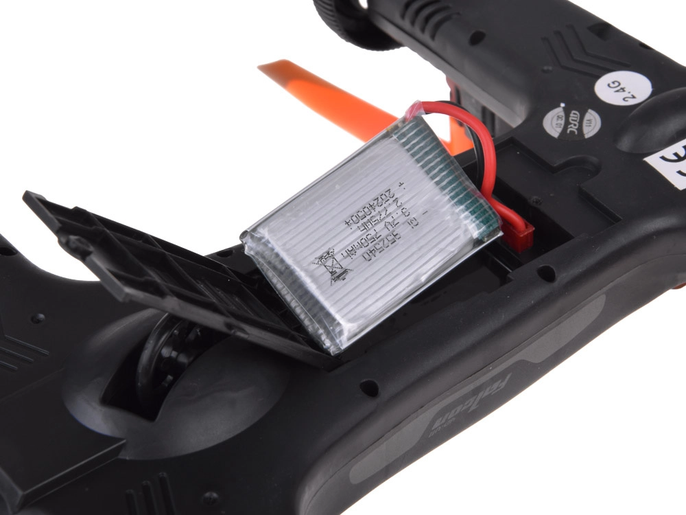 - drone/auto 2‑in‑1, radiocomando, batteria, cavo USB, cacciavite, 2× eliche di ricambio