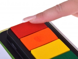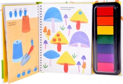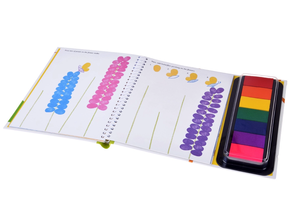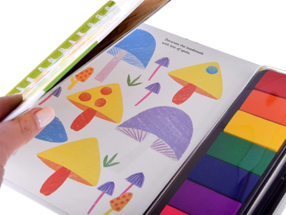Il cuscinetto multicolore è parte del libro: basta intingere il dito e creare fiori colorati, puntini e motivi. Senza disordine e senza bisogno di altri accessori.