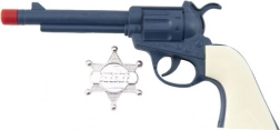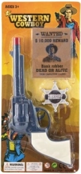 Diventa un piccolo cowboy! Questa rivoltella in plastica con distintivo da sceriffo farà felici tutti i piccoli pistoleri. L’arma emette un suono a scatto; sono inclusi anche il distintivo da sceriffo e il poster “Ricercato” per un divertimento ancora maggiore. Giocattolo ideale per bambini dai 3 anni.