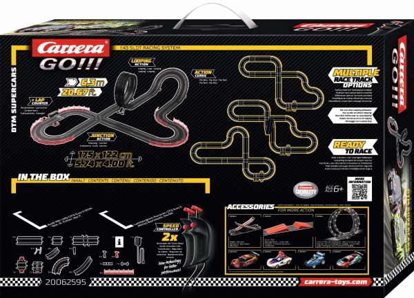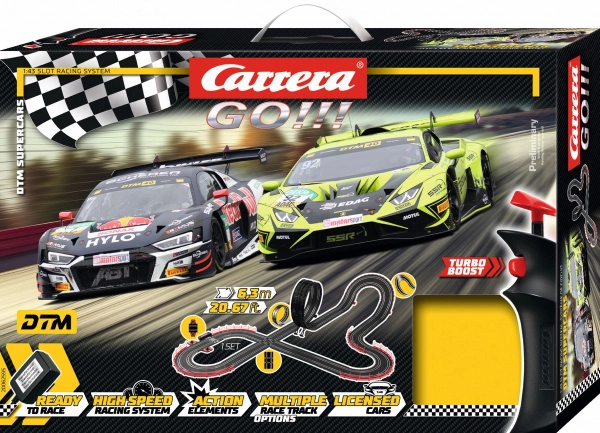 Vivi gare adrenaliniche con la pista CARRERA GO DTM Supercars lunga 6,3 m, con i fantastici modelli Audi R8 LMS GT3 e Lamborghini Huracán GT3. Il set offre curve paraboliche, looping, incrocio e un contagiri meccanico per una vera atmosfera da corsa. Grazie ai controller con Turbo, alle spazzole di contatto doppie e ai magneti, le auto aderiscono perfettamente alla pista garantendo una guida veloce e fluida.