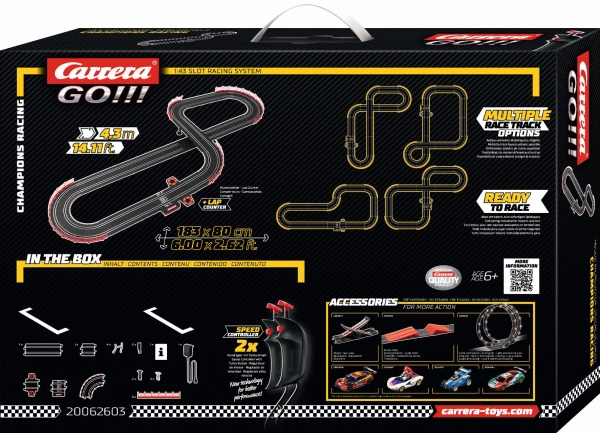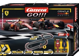 Entra nel mondo della velocità con la pista Carrera GO Champion’s Racing. Il set in scala 1:43 offre esperienze di gara realistiche con le vetture Oracle Red Bull Racing RB21 “M. Verstappen, No.1” (2025) e Ferrari SF-25 “L. Hamilton, No.44” (2025). Grazie alla funzione Turbo sui controller, ai doppi contatti a spazzola e ai magneti godrai di stabilità in curva e velocità sul dritto.