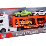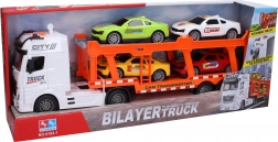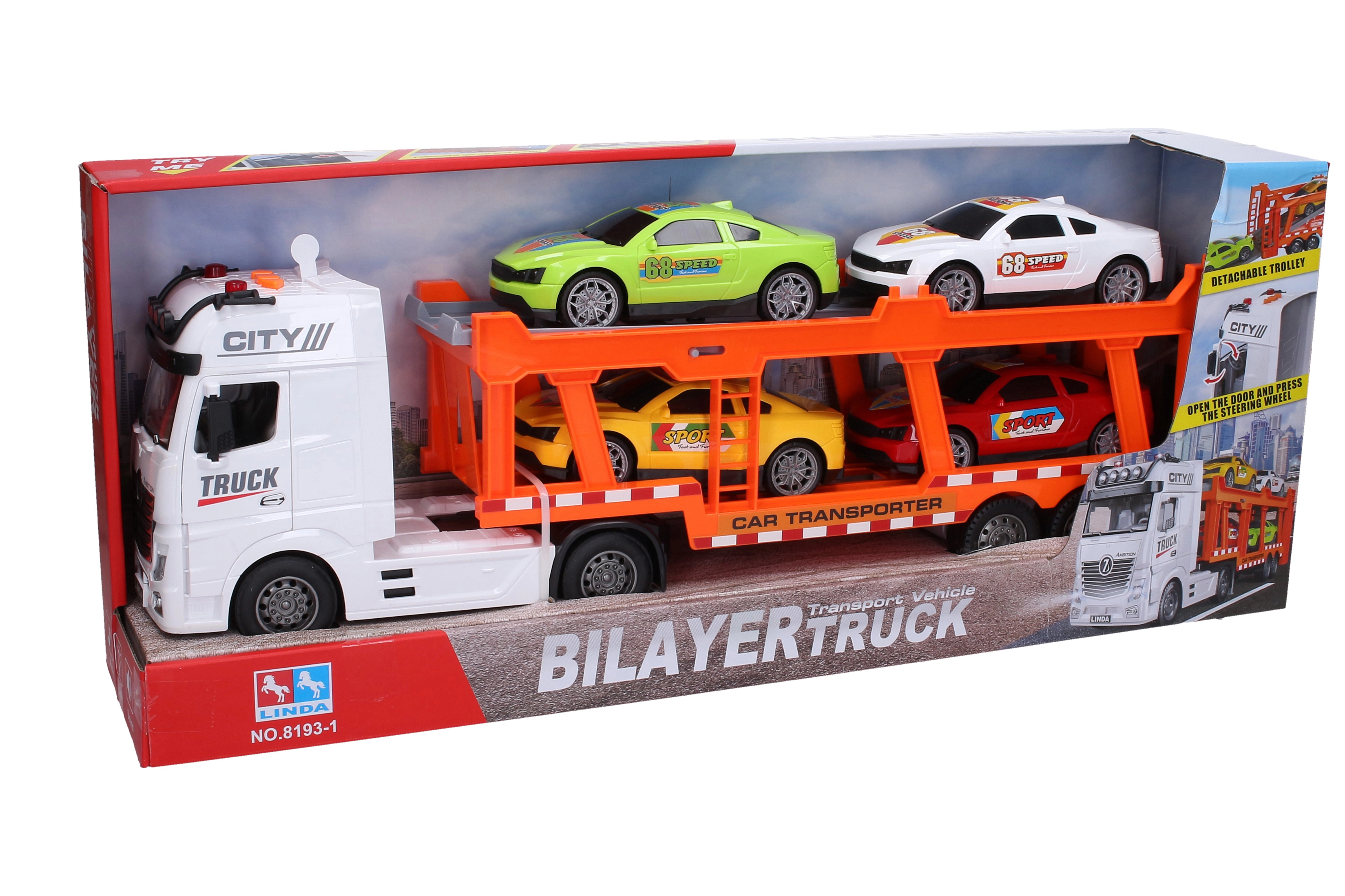 Regalate gioia ai piccoli appassionati di auto con una robusta bisarca a retrocarica lunga ben 56 cm. Il set include quattro auto separate (16 cm) con ruote libere e offre autentici effetti luminosi e sonori – dall’avviamento del motore alla retromarcia, fino al suono del movimento della pedana.