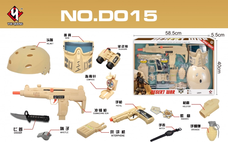 Questo set da soldato color sabbia farà felici tutti i piccoli avventurieri. I bambini apprezzeranno gli accessori realistici che li faranno sentire in missione vera – dall'elmetto e il gilet al compasso e al walkie-talkie. Il fucile funziona manualmente (spostando l'anello arancione verso destra e premendo il grilletto emette il suono di sparo) e la pistola è alimentata da 3× AG13 (batterie incluse nella confezione).