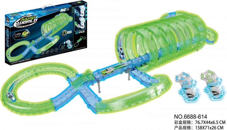 Le macchinine sono alimentate da batterie ricaricabili da 3,7 V (incluse) e i telecomandi funzionano con 4× batterie AAA (non incluse). Grazie ai pezzi fluorescenti la pista brilla al buio e le gare hanno un’atmosfera unica.