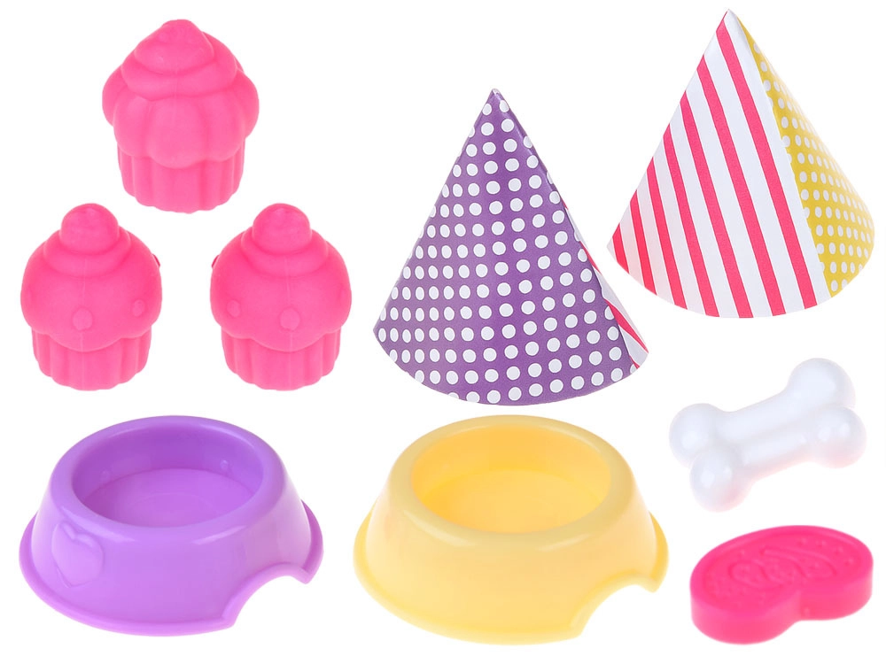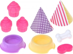 La confezione include una ricca gamma di accessori per inventare sempre nuove storie: dal tavolino e le seggioline alle ciotole per gli animaletti, posate e stoviglie, fino ai cappellini di carta per la festa. Tutto è leggero, adatto alle mani dei bambini e perfetto per lunghe ore di giochi di ruolo.