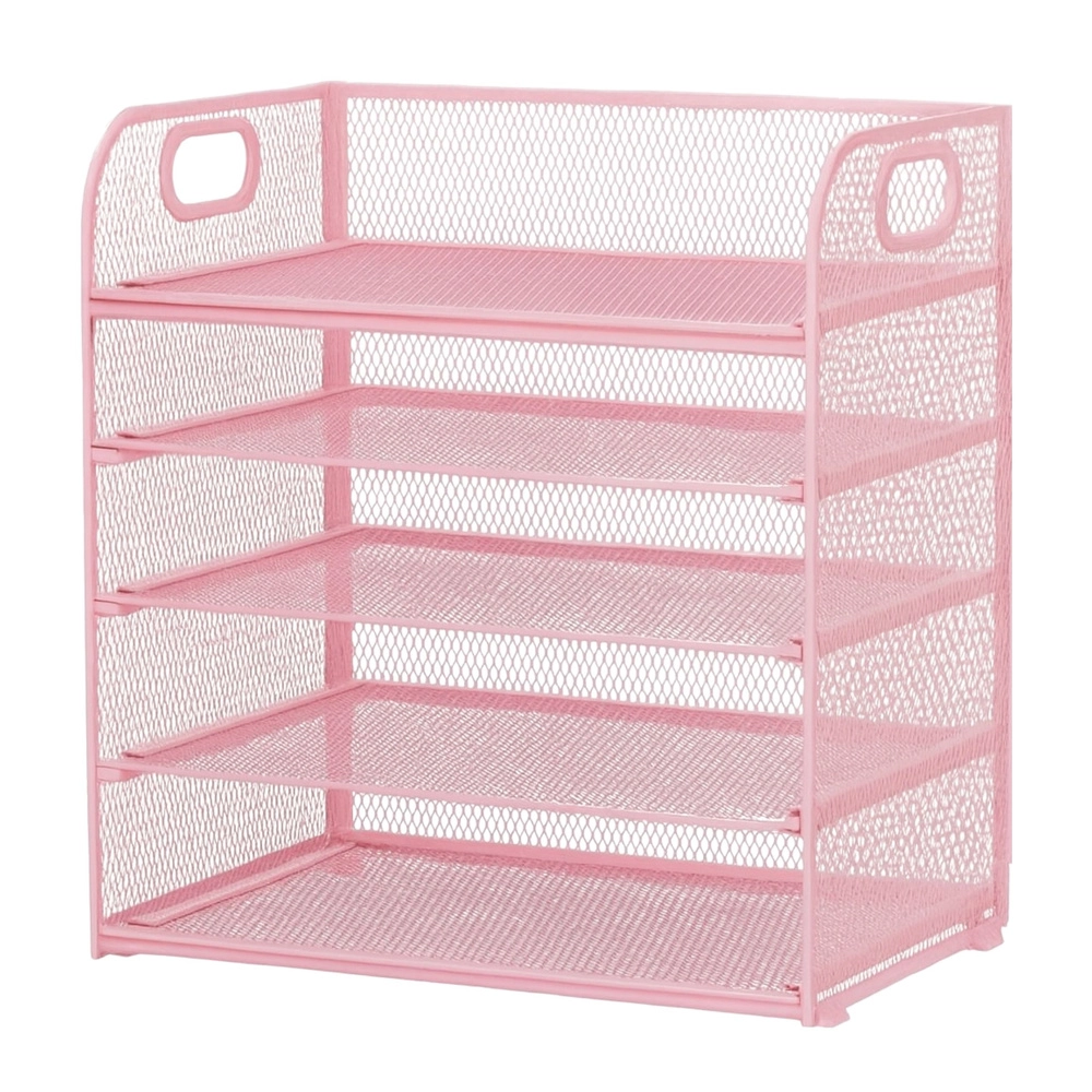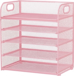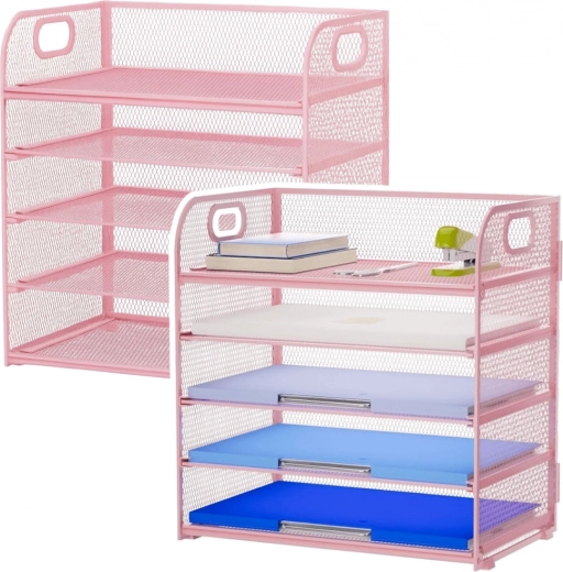 Elegante organizer da scrivania rosa con 5 livelli spaziosi che aiuta a mantenere in ordine documenti, quaderni e accessori da ufficio. La robusta rete metallica con verniciatura a polvere, le maniglie laterali per un facile trasporto e la struttura stabile rendono questo organizer una scelta ideale per ufficio, home office e camera degli studenti.