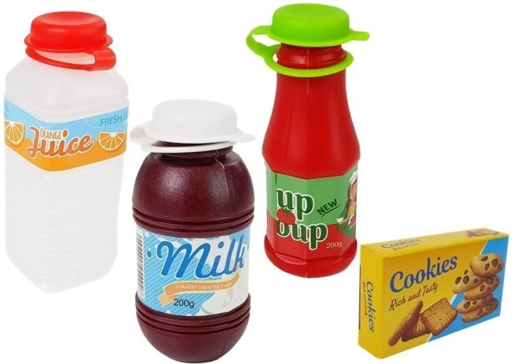 Un set di alimenti come latte, succo, ketchup e biscotti arricchisce il gioco e consente ai bambini di creare diversi scenari di acquisto.
